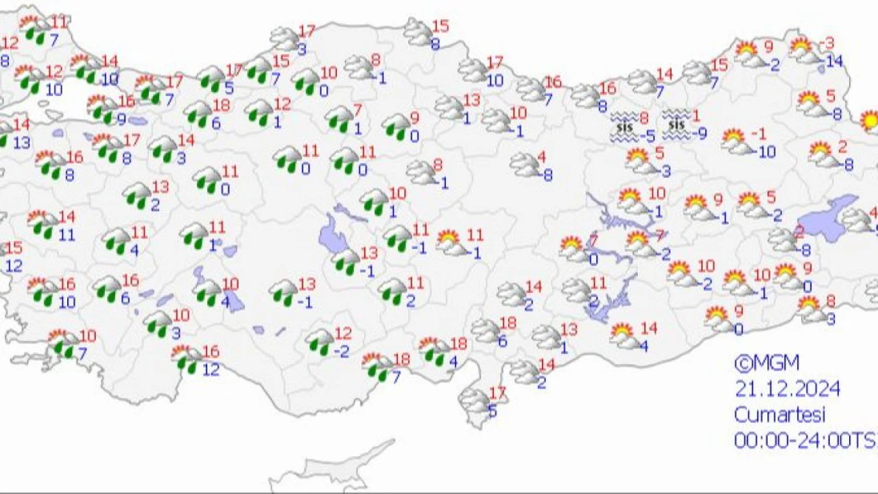 Meteoroloji Genel Müdürlüğü’nün verilerine göre, 21 Aralık Cumartesi günü ülke genelinde yağmur etkili olacak. Özellikle İstanbul, Ege Bölgesi ve İç Anadolu Bölgesi'nde sağanak yağışlar görülecek. Ancak, Doğu Anadolu Bölgesi'nde kar yağışı bekleniyor ve diğer bölgelerde ise daha güneşli bir hava hakim olacak.