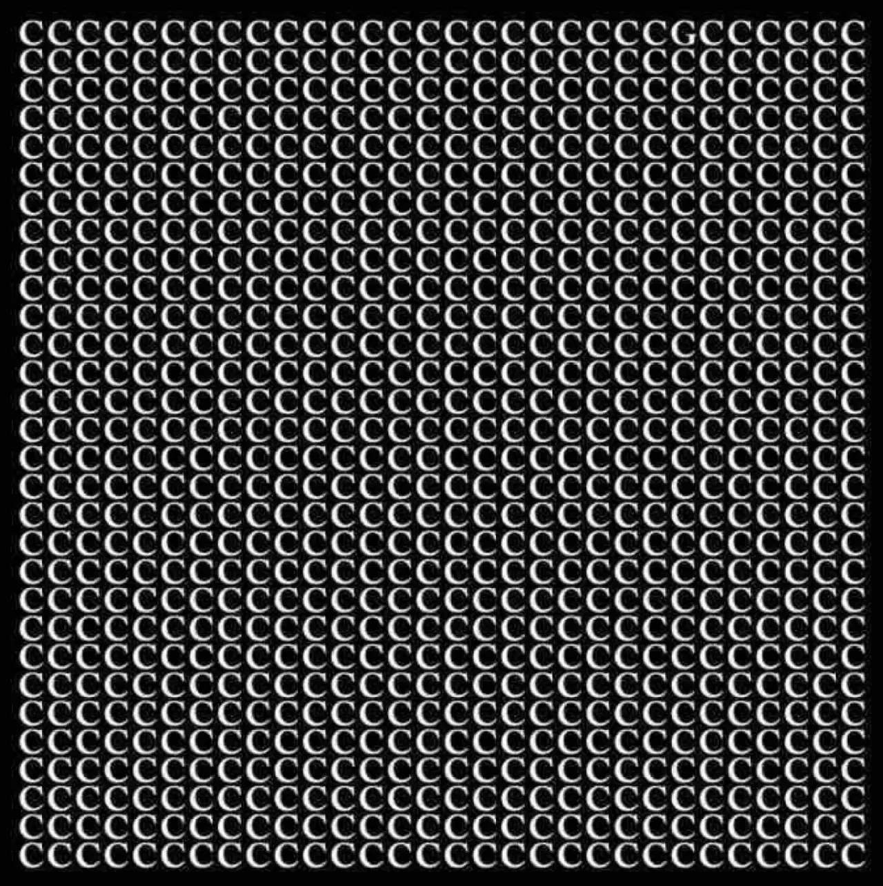 Yukarıda tarif edilen görseldeki yüzlerce "C" harfinin arasında gizlenmiş olan o tek "G" harfini bulmak için şimdi kendinizi test edebilirsiniz. Süreniz sadece 5 saniye. Eğer "G" harfini bu kısa zaman diliminde bulabildiyseniz, dikkat ve görsel algı becerilerinizin oldukça iyi olduğu söylenebilir. Eğer bulmakta zorlandıysanız, endişelenmeyin; bu tür bulmacalar pratik yaptıkça daha kolay çözülebilir hale gelir. İşte yüzlerce C harfi arasına gizlenmiş G harfi:
