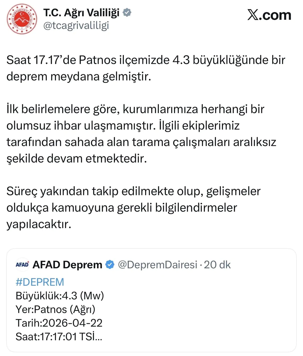 Depremin ardından bölgedeki durumu yakından takip eden Ağrı Valiliği, resmi kanallar aracılığıyla bir bilgilendirme yayımladı. Yapılan ilk incelemelerde, depremin merkez üssü ve çevresinde herhangi bir can ya da mal kaybına yönelik olumsuz bir ihbarın ulaşmadığı vurgulandı.