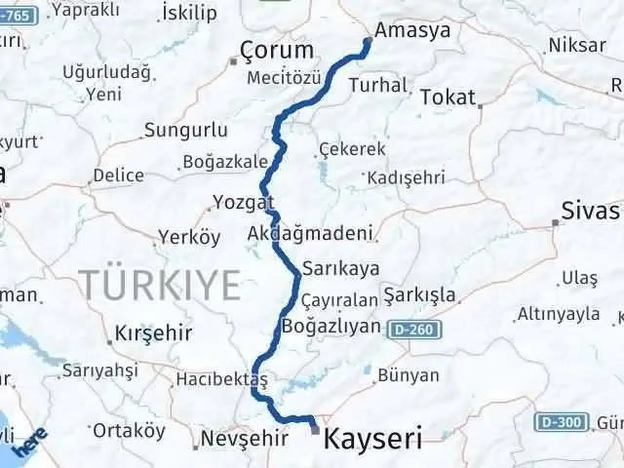 Amasya’dan Kayseri’ye ulaşım için en verimli ve kısa rota şu şekilde öne çıkıyor: