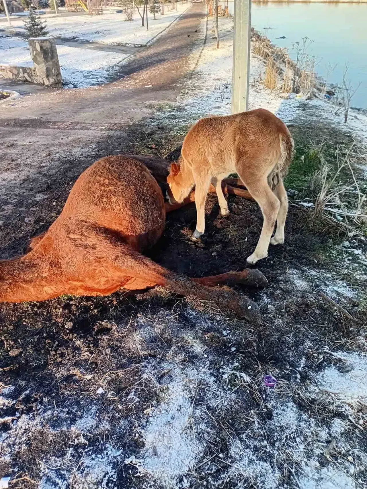 Kura Nehri kıyısında dondurucu soğuklara yenik düşen kısrağın yanından bir an olsun ayrılmayan yavrusu, doğanın en acı ve duygusal anlarından birini yaşattı.