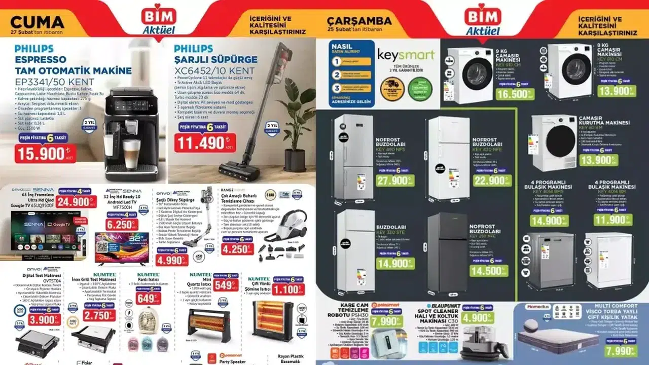 BİM’in 27 Şubat 2026 Cuma aktüel kataloğu belli oldu ve haftanın merakla beklenen ürünleri raflara inmeden gündem oldu. Bu hafta özellikle kahve tutkunlarının radarına giren Philips Espresso Tam Otomatik Makine dikkat çekerken, küçük ev aletlerinden ev yaşam ürünlerine uzanan geniş bir liste öne çıkıyor. 24-27 Şubat tarihleri arasında geçerli kampanya kapsamında temel gıda, temizlik ve kişisel bakım ürünleri de fiyatlarıyla dikkat çekiyor. “Hangi ürün kaç TL?” sorusunun yanıtı için 27 Şubat BİM aktüel kataloğunun tam listesi ve öne çıkan detaylar şöyle…
