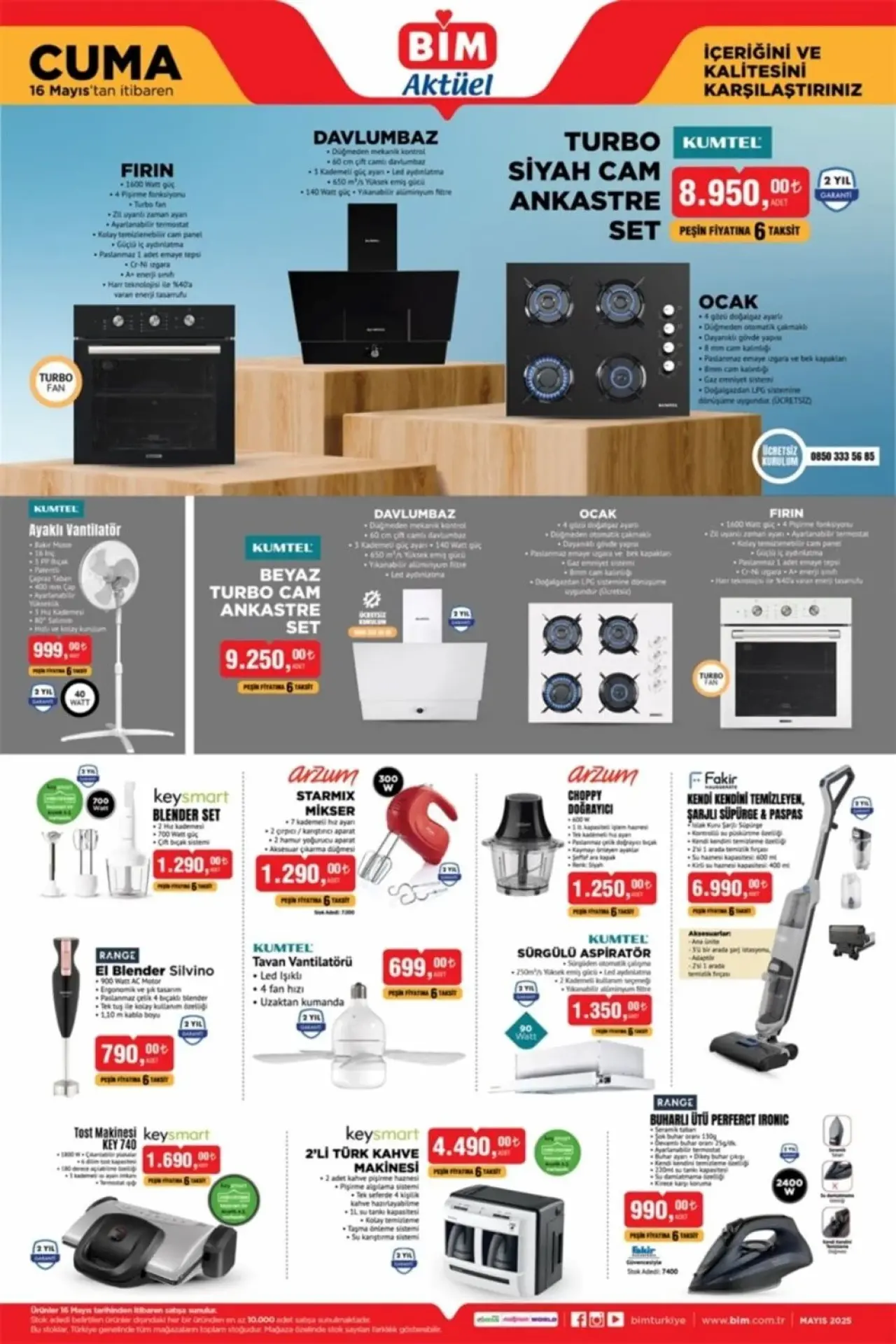 Mutfaklarını yenilemek ve ev işlerini daha keyifli hale getirmek isteyenler için de 16 Mayıs Cuma günü BİM'de kaçırılmayacak fırsatlar bulunuyor. Şık bir görünüm ve fonksiyonellik sunan Turbo siyah cam ankastre set 8.950 TL'den satışa çıkarken, yaz sıcaklarına hazırlık olarak ayaklı vantilatör 999 TL, tavan vantilatörü ise 699 TL fiyatla sunulacak. Mutfaktaki yardımcılarınızdan blender seti ve Arzum mikser 1.290 TL, doğrayıcı 1.250 TL, tost makinesi 1.690 TL ve 2'li Türk kahvesi makinesi 4.490 TL olacak. Temizlikte büyük kolaylık sağlayan Fakir kendi kendini temizleyen şarjlı süpürge ve paspas 6.990 TL, buharlı ütü 990 TL, el blenderı 790 TL ve sürgülü aspiratör 1.350 TL gibi ürünler de Cuma günü BİM raflarında yerini alacak.
