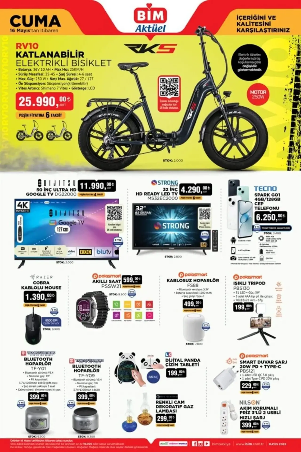 BİM'in 16 Mayıs Cuma günü satışa sunacağı teknoloji ürünleri arasında dikkat çekici pek çok seçenek yer alıyor. Çevre dostu ulaşım arayanlar için RKS RV10 katlanabilir elektrikli bisiklet 25.990 TL fiyat etiketine sahip olacak. Evde sinema keyfi için Dijitsu 50 İnç Ultra HD Google TV 11.990 TL'den, günlük iletişim ihtiyaçları için Spark GO 4GB/128GB cep telefonu 6.250 TL'den ve oyun tutkunları için Razer Cobra kablolu mouse 1.390 TL'den raflarda olacak. Giyilebilir teknoloji meraklıları için Polosmart akıllı saat 599 TL, müzikseverler için kablosuz hoparlör 499 TL ve Bluetooth hoparlör 399 TL, içerik üreticileri için ışıklı tripod 199 TL ve yaratıcı minikler için dijital panda çizim tableti de yine 199 TL'den Cuma günü BİM müşterilerini bekleyecek.