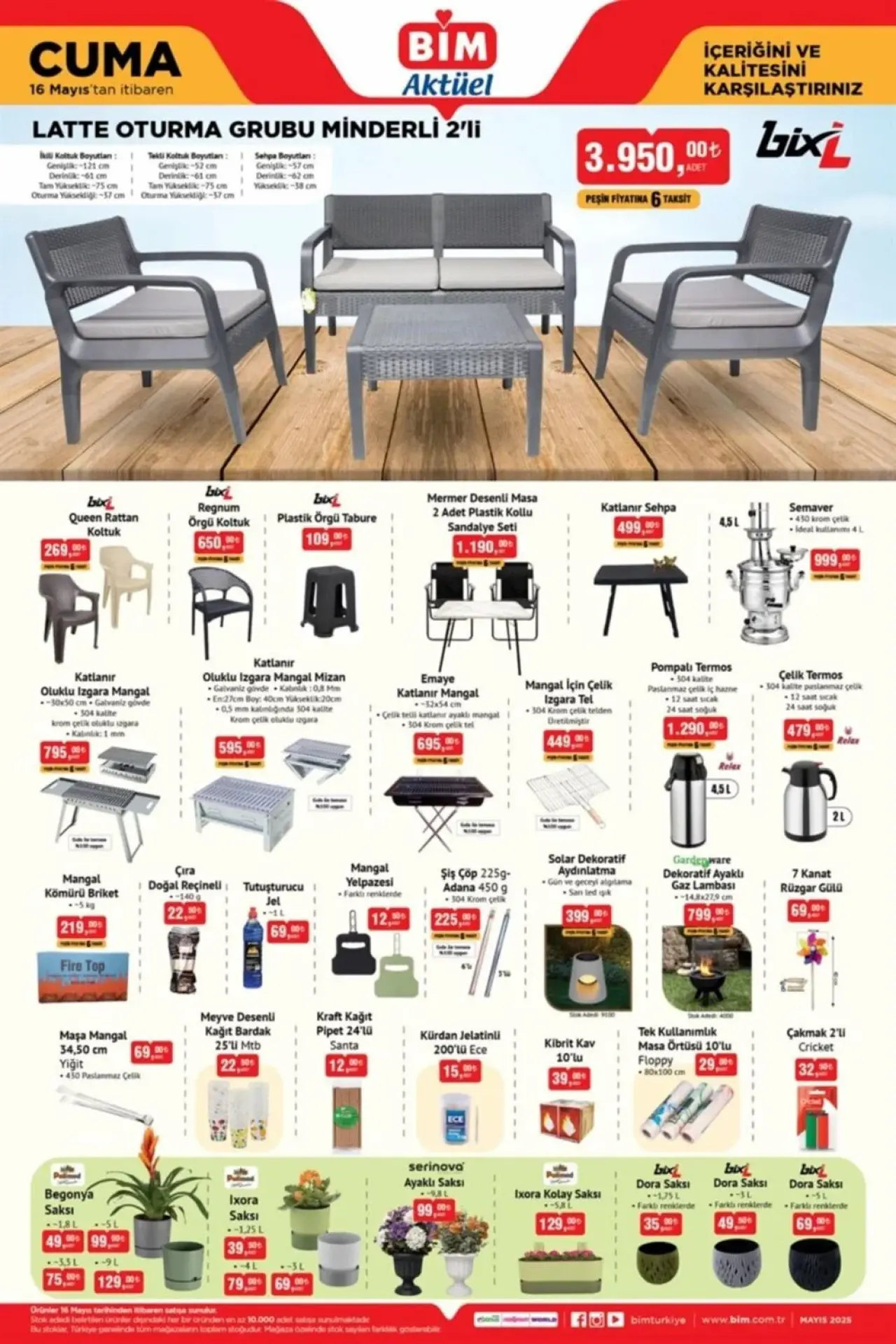 BİM, 16 Mayıs Cuma günü evini ve bahçesini güzelleştirmek isteyenleri de unutmuyor. 5 parça Rimini oturma grubu 7.999 TL, 3 kişilik gölgelikli salıncak 7.500 TL ve Latte 2'li minderli oturma grubu 3.950 TL gibi büyük parçaların yanı sıra Queen rattan koltuk 269 TL, Regnum örgü koltuk 650 TL ve plastik örgü tabure 109 TL gibi tekli mobilyalar da satışta olacak. Ev düzeni için 4 raflı çok amaçlı dolap 1.990 TL, Konak metal ayakkabılık 1.290 TL, tek kapaklı 5 raflı dolap 1.550 TL ve ahşap çocuk yatağı 999 TL'den alıcılarını bekleyecek. Ayrıca, mermer desenli masa ve 2 adet plastik kollu sandalye seti 1.190 TL, katlanır sehpa ise 499 TL olarak fiyatlandırıldı.