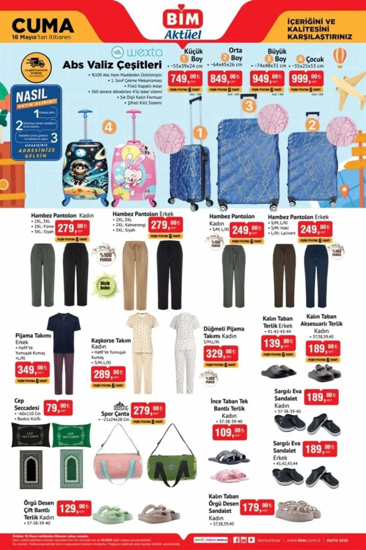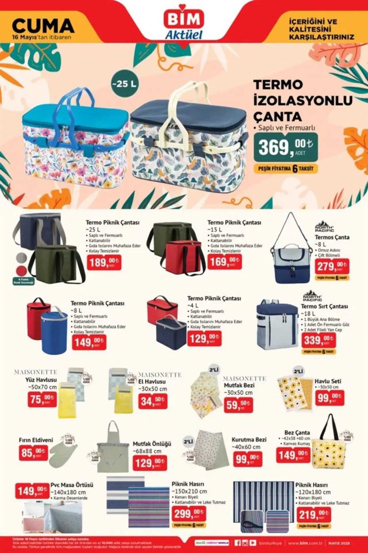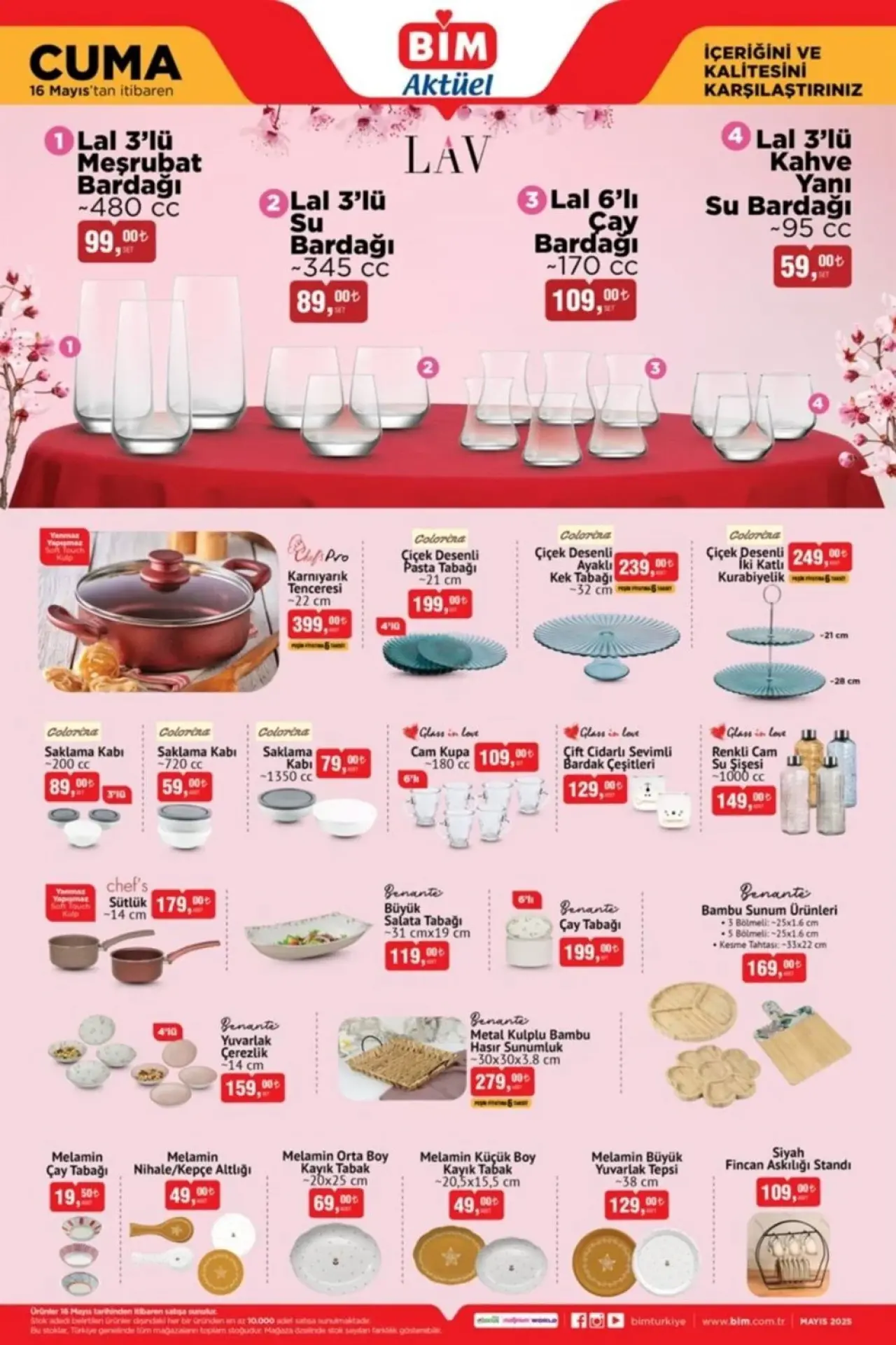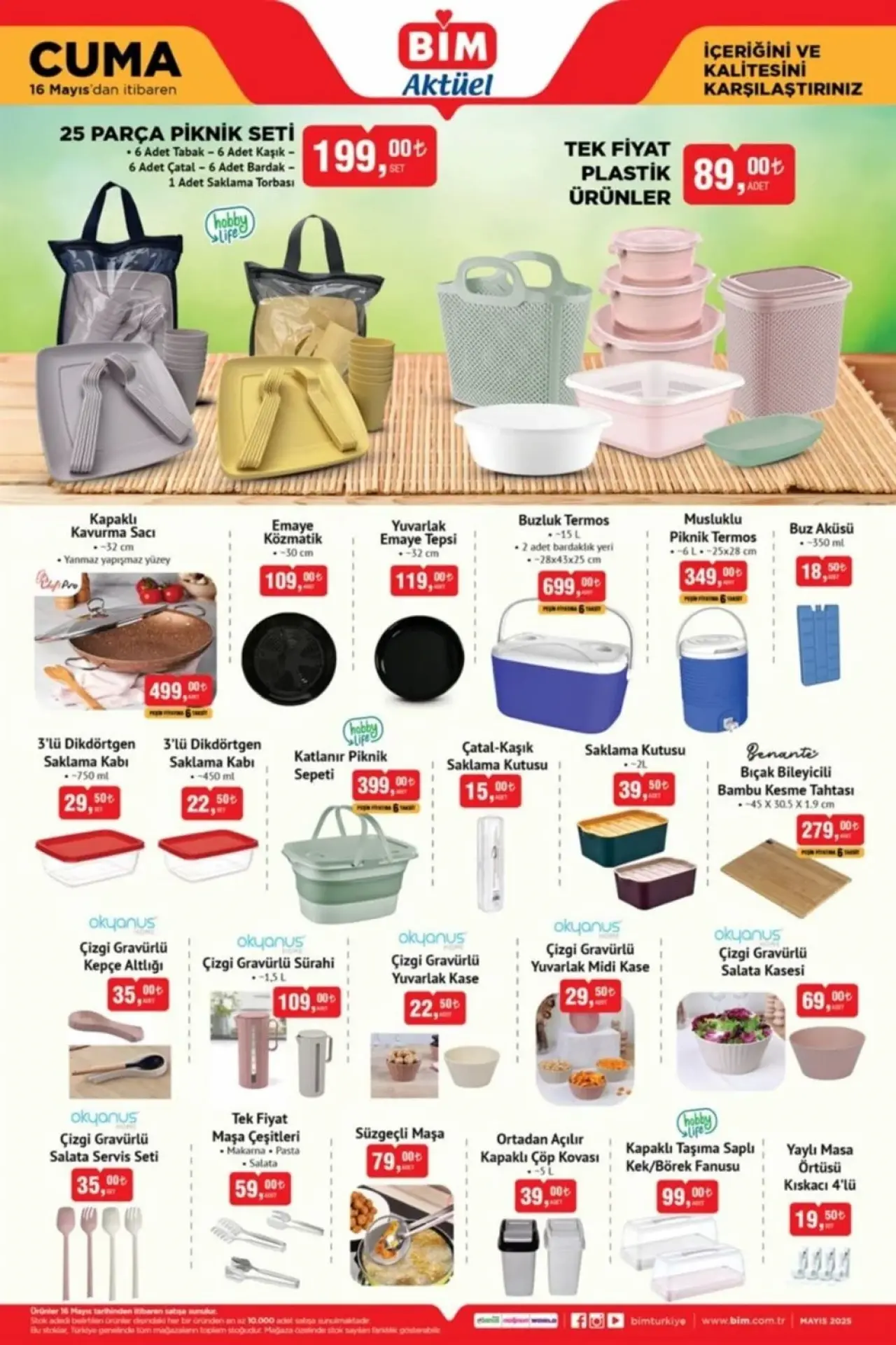 Yaz hazırlıkları kapsamında piknik ve seyahat severler için de BİM'de birçok ürün bulunacak. 25 parça piknik seti 199 TL, kapaklı kavurma sacı 499 TL, emaye közmatik 109 TL, yuvarlak emaye tepsi 119 TL, çeşitli boyutlarda buzluk termoslar (699 TL, musluklu piknik termos 349 TL), bıçak bileyicili bambu kesme tahtası 279 TL ve katlanır piknik sepeti 399 TL'den satışa sunulacak. Farklı ebatlarda termo çantalar da 129 TL'den başlayan fiyatlarla raflarda olacak. Seyahatler için ABS valizler; küçük boy 749 TL, orta boy 849 TL, büyük boy 949 TL ve çocuk valizi 999 TL'den müşterileri bekleyecek. Giyim kategorisinde ise kadın ve erkek için hambez pantolonlar 279 TL, erkek pijama takımı 349 TL, kadın kaşkorse takımı 289 TL ve düğmeli kadın pijama takımı 329 TL gibi ürünler yer alıyor. Ayrıca mutfak eşyalarından Lal markalı 3'lü meşrubat bardağı 99 TL, 3'lü su bardağı 89 TL, 6'lı çay bardağı 109 TL, çiçek desenli iki katlı kurabiyelik 249 TL, ayaklı kek tabağı 239 TL, 4'lü çiçek desenli pasta tabağı 199 TL ve 22 cm karnıyarık tenceresi 399 TL olarak satışa çıkacak.