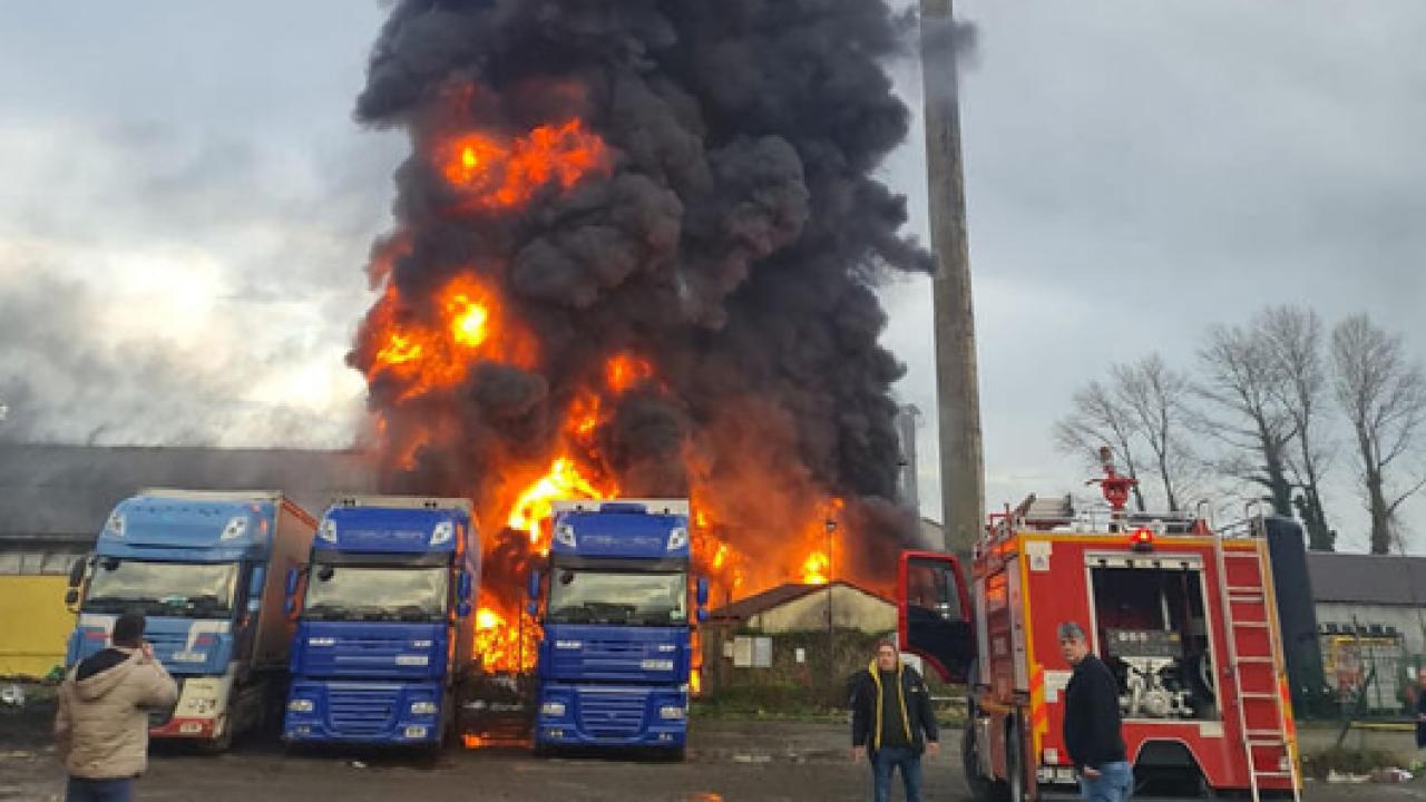 Alevler kısa sürede büyüyerek fabrikayı sardı, gökyüzü siyah dumanla kaplandı.