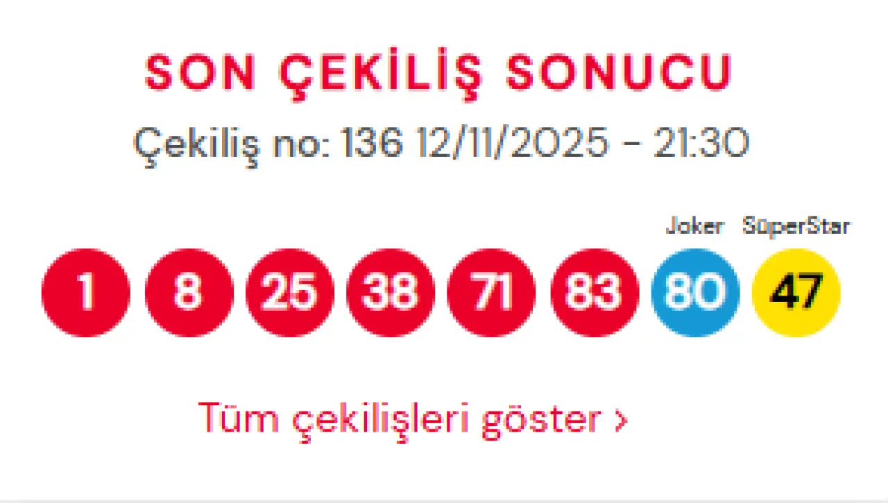 Kazanan numaralar şu şekilde belirlendi: 1,38,25,38,71,83+ 80 (Joker) ve 47 (Süperstar). Katılımcılar, biletlerinde bu numaraları arayarak büyük ödül şansını değerlendirebilir.