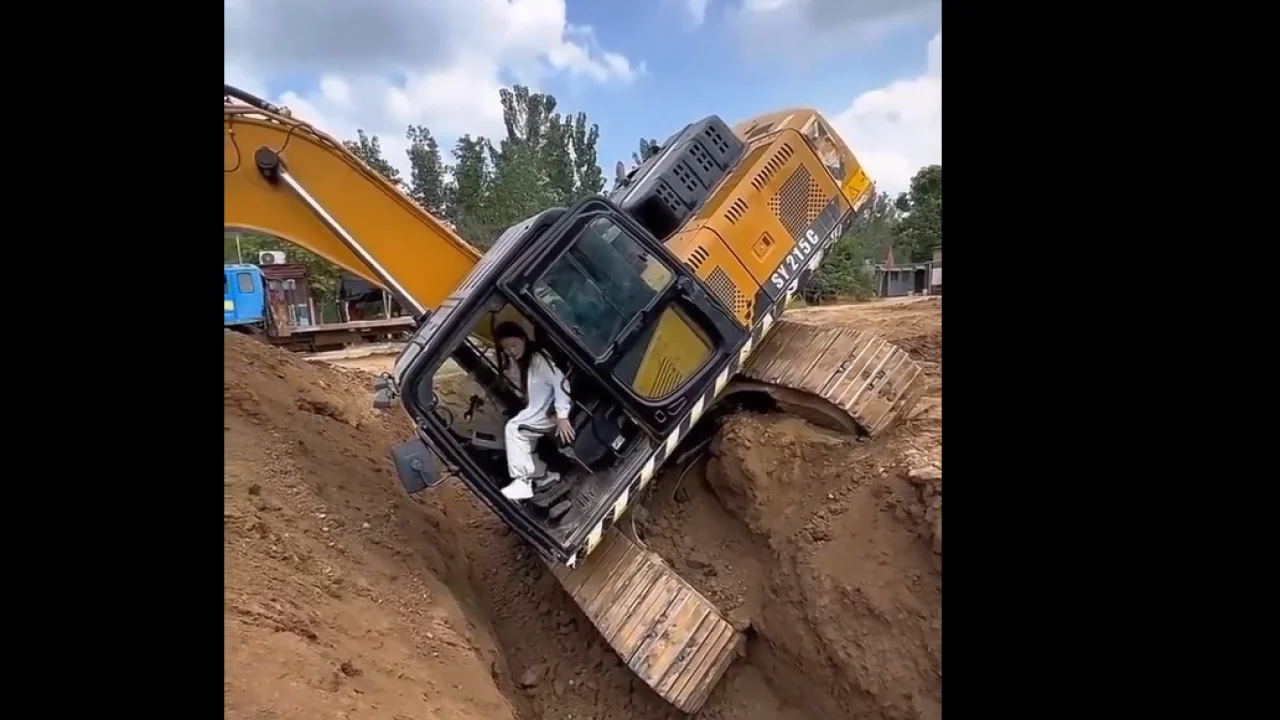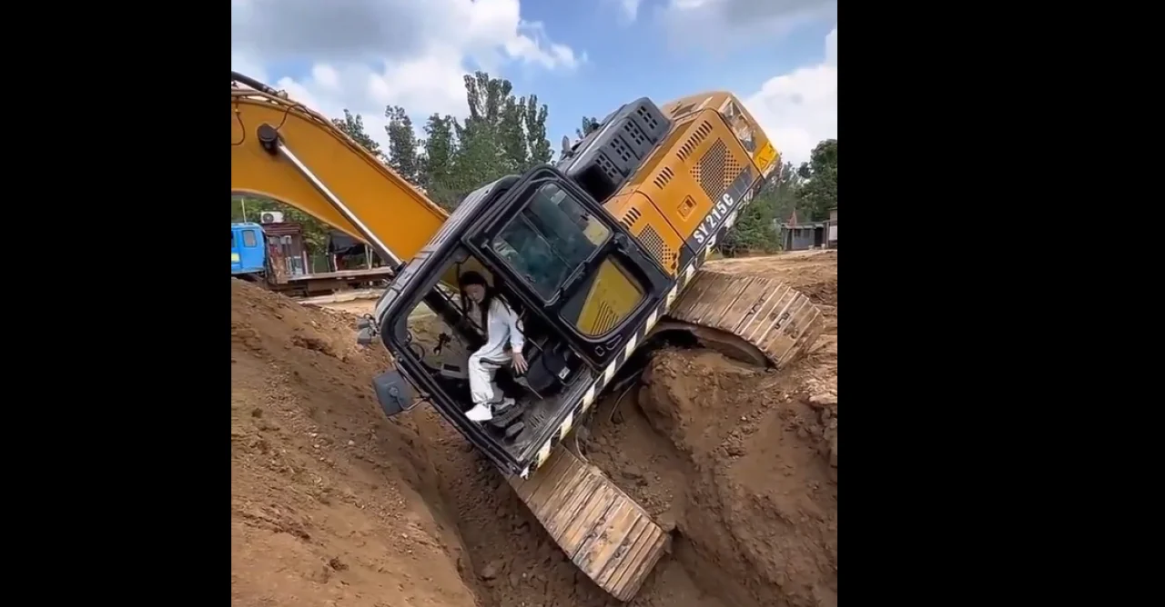 Erkek sürücü iş makinasını kurtarmayı başaramayınca çareyi usta kadın şoföre bıraktı! Genç kadın saniyeler içinde aracı, düştüğü yerden çıkarmayı başararak takdir topladı.