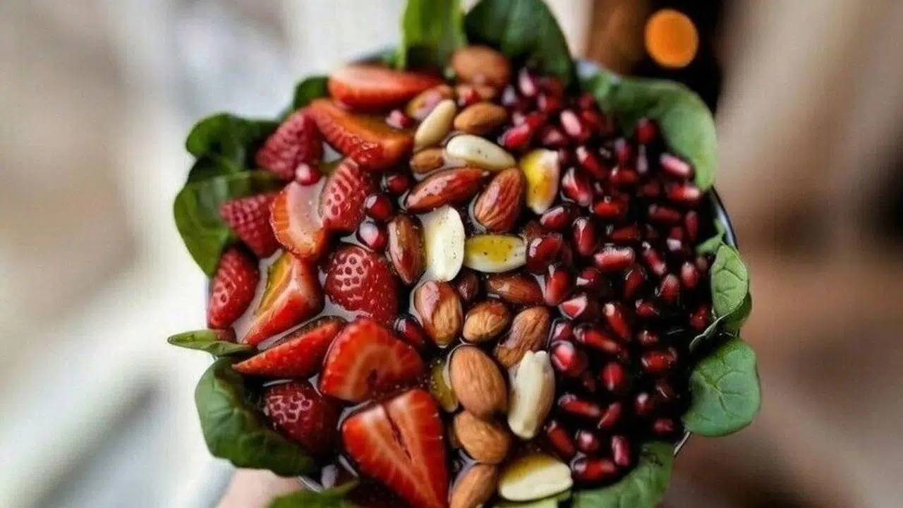 Tatlı ve ekşi aromaların bir araya geldiği tarif, yeşilliklerin taze dokusuyla hazırlanıyor. Nar ve çileğin birlikte kullanıldığı salatada file badem de yer alıyor.