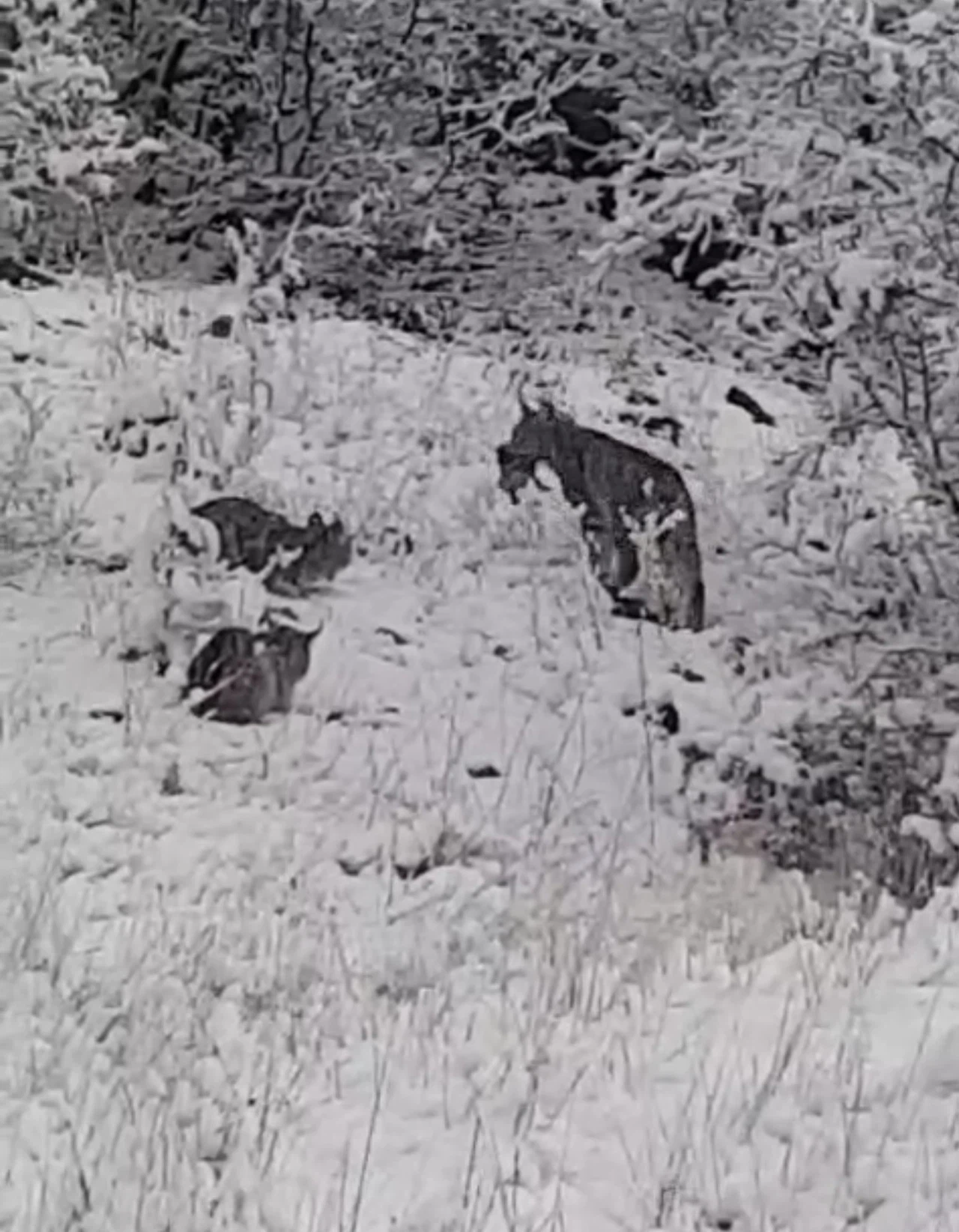 Kar üzerinde yakaladıkları kekliği yerken Kenan Çavundur tarafından görüntülenen vaşaklar daha sonra ormanlık alana girerek gözden kayboldu. O anlar cep telefonu kamerasına yansıdı.