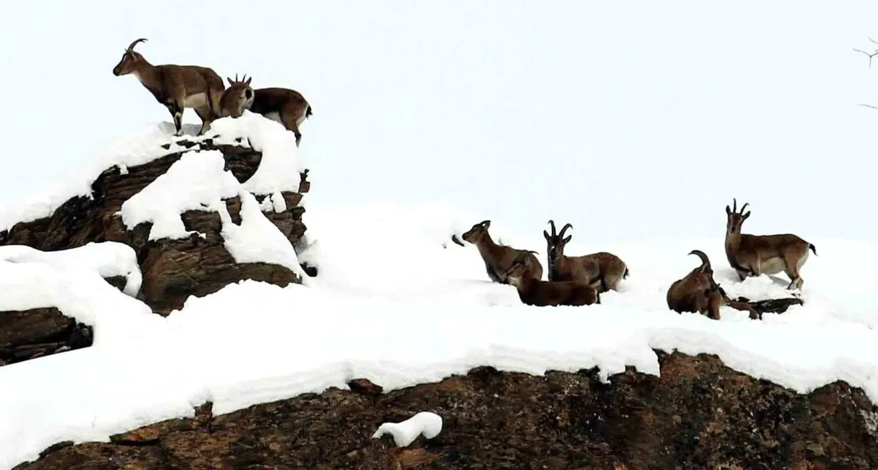 Dünya Doğa Koruma Birliği (IUCN) tarafından hazırlanan ve nesli tükenme tehlikesiyle karşı karşıya olan türlerin yer aldığı Kırmızı Liste’de bulunan dağ keçileri, bölgenin en kıymetli sakinleri arasında yer alıyor. Avlanması kesinlikle yasak olan ve devlet koruması altında bulunan bu zarif hayvanlar, sarp kayalıklar ve karla kaplı yamaçlarda sürüler halinde dolaşırken görüntülendi.