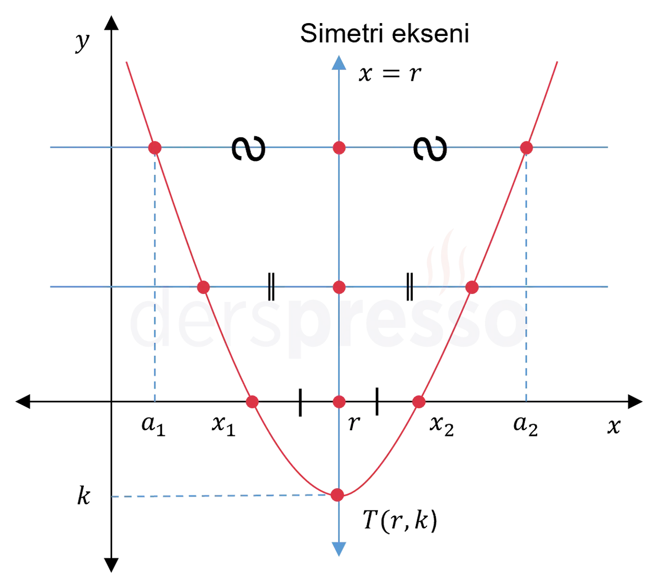 Örneğin, ikinci dereceden bir fonksiyonun grafiğinde tepe noktası (vertex) simetri ekseninin üzerinde yer alır. Grafiğin iki kolu bu doğruya göre simetriktir.