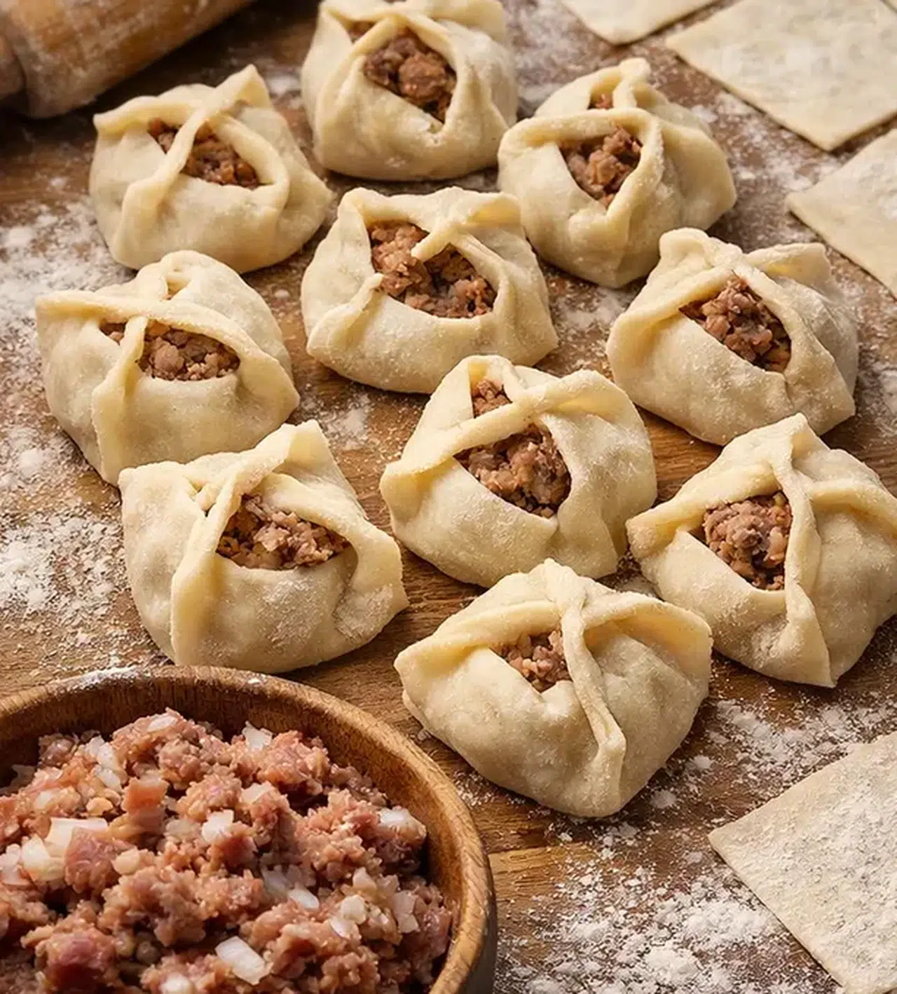 Hamur, klasik mantıya kıyasla biraz daha kalın tutuluyor. Bu sayede mantılar haşlama sırasında dağılmadan pişiyor ve iç harcı daha iyi muhafaza ediliyor.