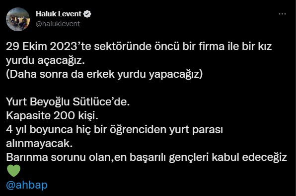 Levent; "29 Ekim 2023'te sektöründe öncü bir firma ile bir kız yurdu açacağız. (Daha sonra da erkek yurdu yapacağız) Yurt Beyoğlu Sütlüce'de. Kapasite 200 kişi. 4 yıl boyunca hiç bir öğrenciden yurt parası alınmayacak. Barınma sorunu olan, en başarılı gençleri kabul edeceğiz." ifadelerini kullandı.