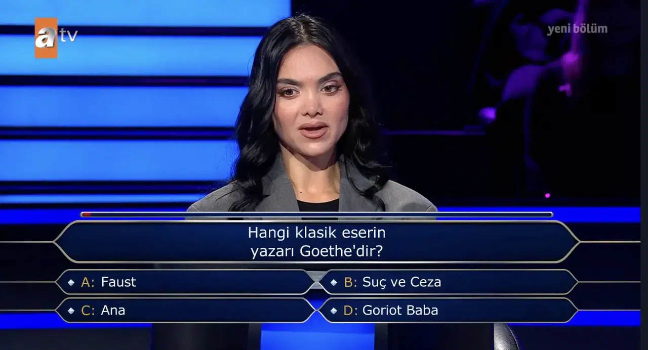 Bilgi yarışmasının son bölümünde yarışmacıya yöneltilen klasik edebiyat sorusu izleyicilerin dikkatini çekti. Dünya edebiyatının en önemli isimlerinden biri olarak kabul edilen Goethe hakkında gelen soru, özellikle kitap ve kültür meraklılarının ilgisini topladı.