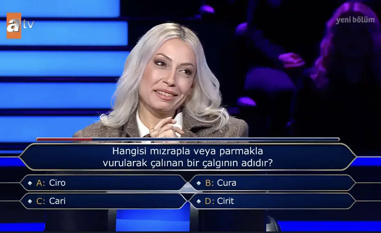 ATV ekranlarında Oktay Kaynarca’nın sunumuyla yayınlanan Kim Milyoner Olmak İster, her bölümde izleyicilerin ilgisini çeken sorularıyla gündem olmaya devam ediyor. Yarışmada yöneltilen sorular yalnızca yarışmacıyı değil, ekran başındaki izleyicileri de düşündürüyor. Programın son bölümünde sorulan “Hangisi mızrapla veya parmakla vurularak çalınan bir çalgının adıdır?” sorusu da kısa sürede merak edilen sorular arasında yer aldı.