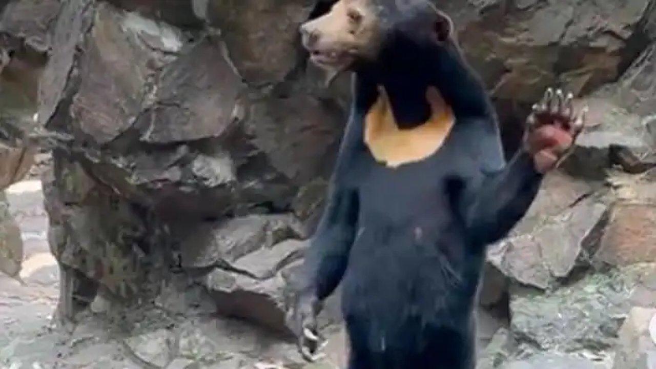 Videoda, güneş ayısının, kafesinin kenarında dimdik durduğu, pençelerini yanında tuttuğu ve görünüşe göre hayvanat bahçesinin ziyaretçilerini gözlemlediği görüldü.