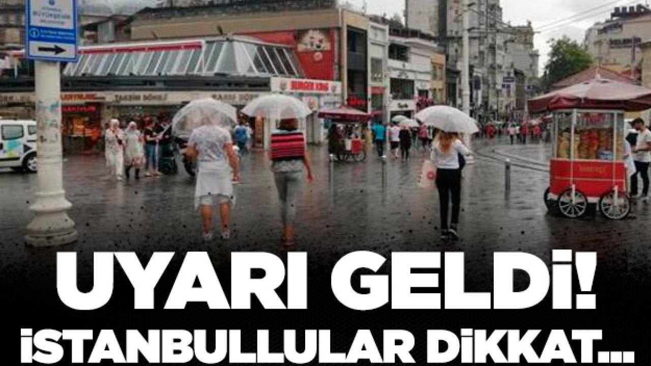 Milyonlarca kişinin yaşadığı İstanbul'da öğle sonrası için yağmur uyarısı verildi. Meteoroloji Genel Müdürlüğü; "Bugün öğleden sonra özellikle kuzey ilçeleri başta olmak üzere İstanbul ve Kocaeli çevrelerinde beklenen yağışların yerel olarak kuvvetli(21-50 kg/m2) olması beklendiğinden ani sel, su baskını, yıldırım, yağış anında kuvvetli rüzgar gibi olumsuzluklara karşı dikkatli ve tedbirli olunması gerekmektedir." açıklamasında bulundu.