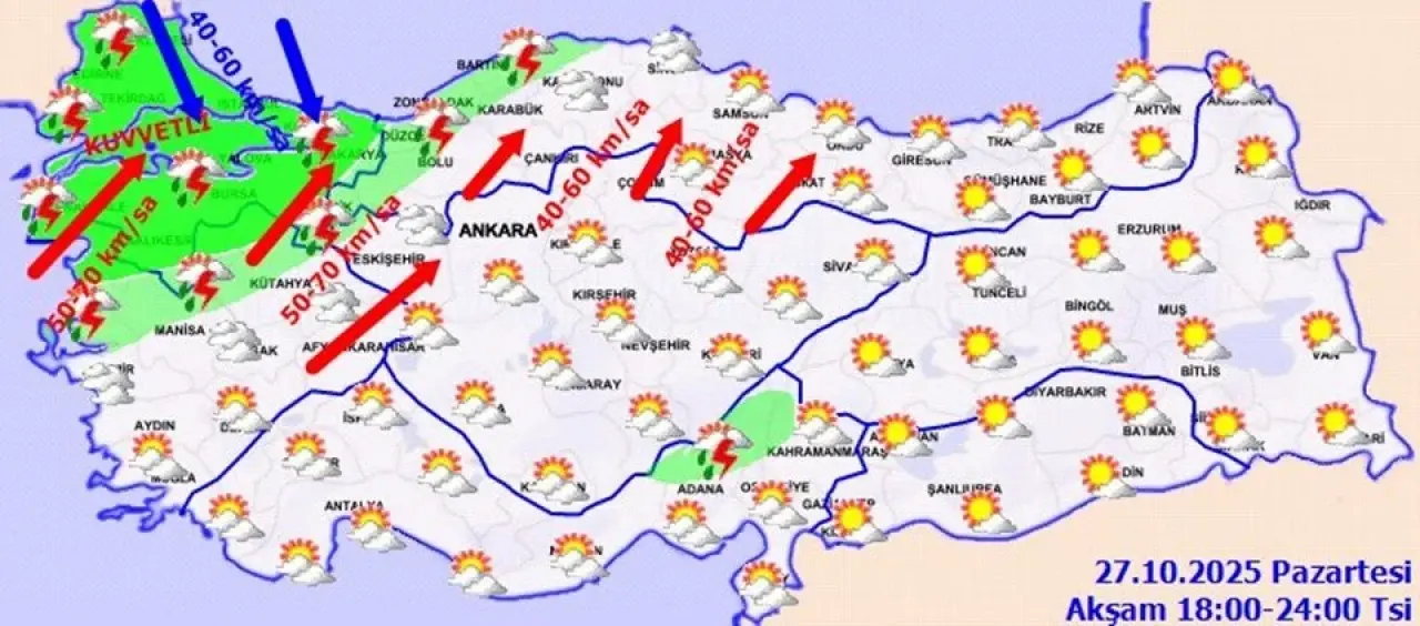 Meteoroloji Genel Müdürlüğü (MGM) verilerine göre Marmara ve Ege ile İç Anadolu’nun kuzey ve batı, Karadeniz’in iç kesimlerinde saatteki hızı 70 kilometreye ulaşacak fırtına bekleniyor.