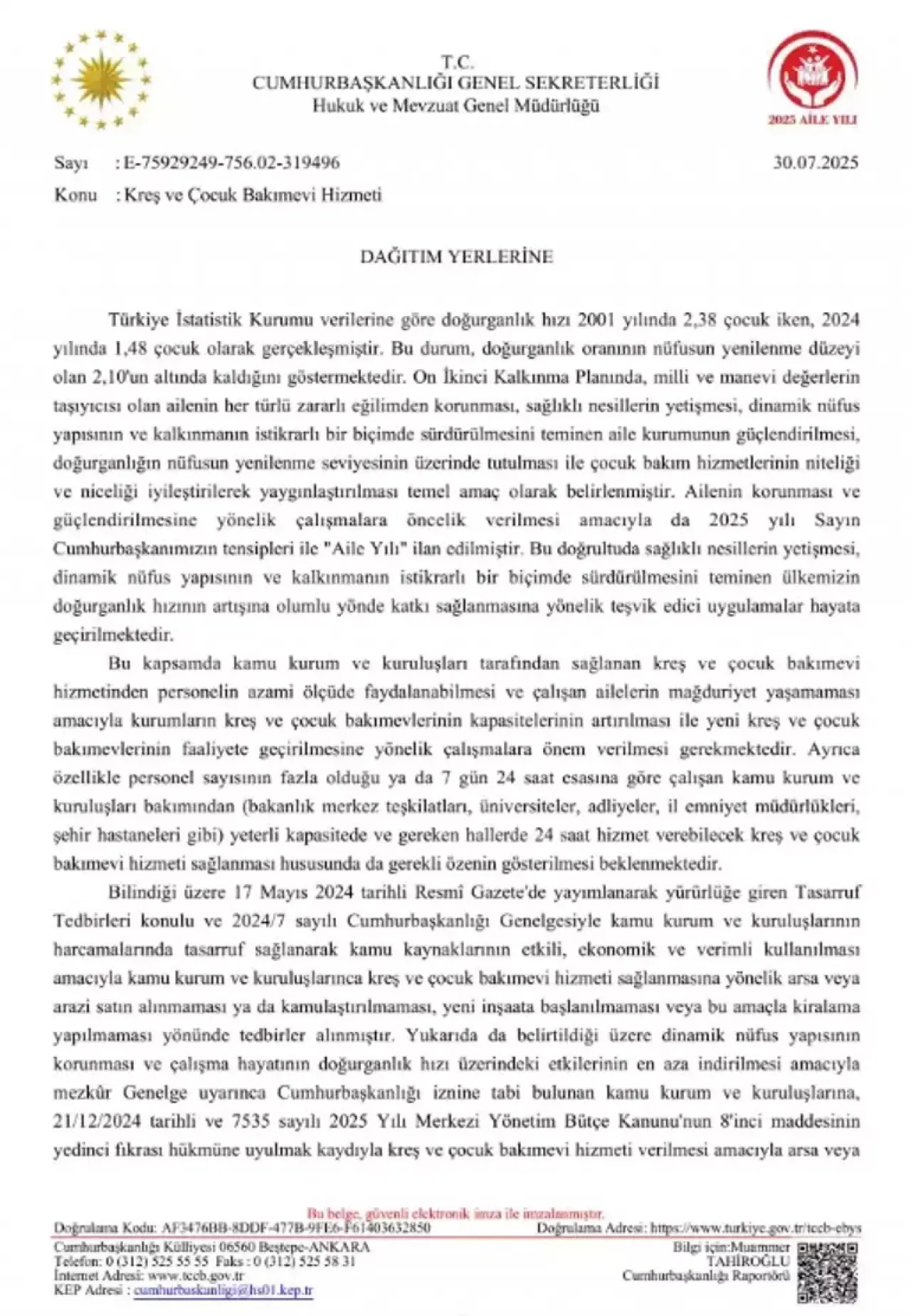 2025’in "Aile Yılı" ilan edilmesinin ardından toplumun temel direği olan aile kurumunu güçlendirecek yeni bir hamle daha devreye giriyor. Kamu kurumlarında kreş ve gündüz bakımevlerinin sayısı artırılıyor. Cumhurbaşkanlığı tarafından tüm kamu kurumlarına gönderilen resmi yazıyla, çocuk bakım hizmetlerinin altyapısı genişletilecek.