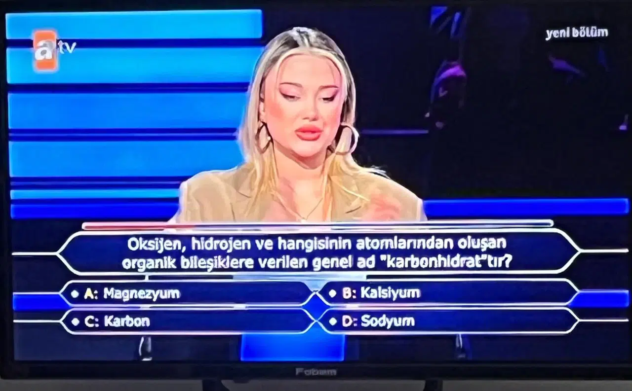 Karbonhidratların yapısını konu alan soru, basit gibi görünmesine rağmen şıklarıyla yarışmacıyı tereddütte bıraktı. İzleyiciler arasında da büyük merak uyandıran soru, sosyal medyada sıkça aratılanlar arasına girdi.