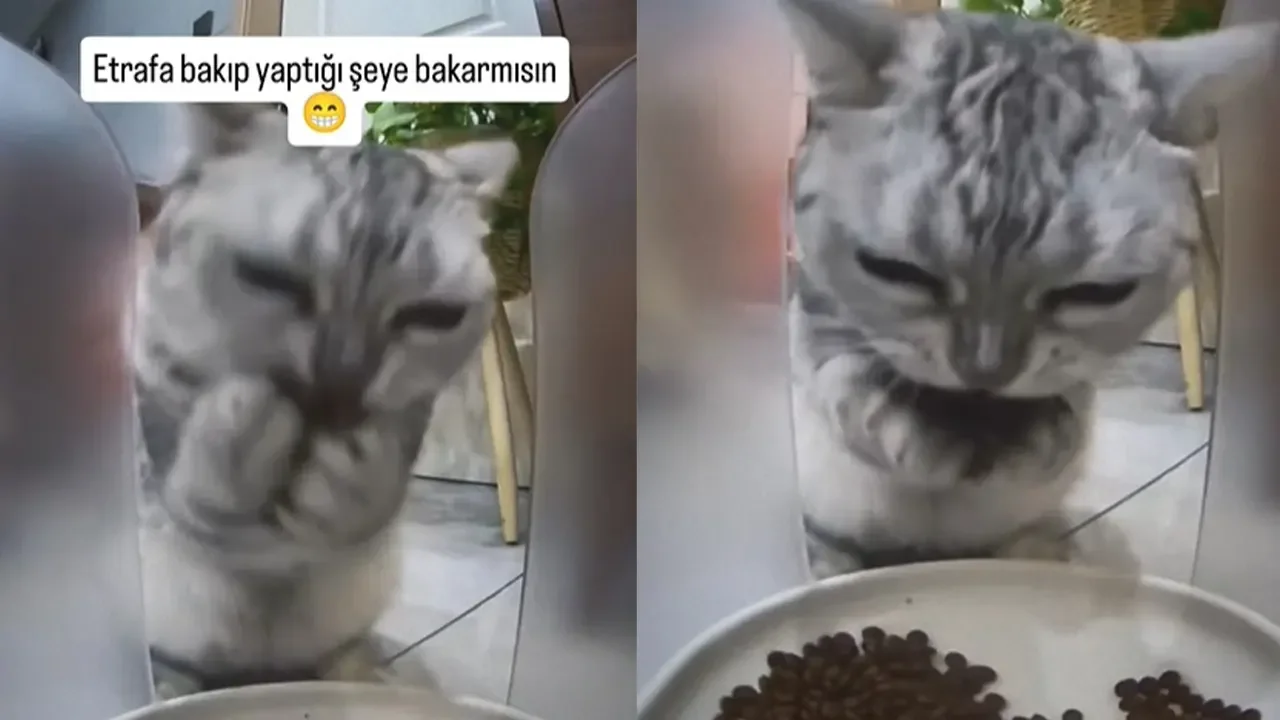 Aç olan bir yavru kedinin akıllıca yaptığı komik hareketleri izleyenleri güldürdü. Nerede çekildiği bilinmeyen görüntülerde yavru kedi, mama kabına ulaşabilmek için ilk önce etrafı gözetledi. Ardından civarda kimsenin olmadığını anlamasıyla hızla mamaları patisiyle ağzına boca etti. O anlarda mama kabının üzerine konulan gizli kamera ise gerçekleri ortaya çıkardı.