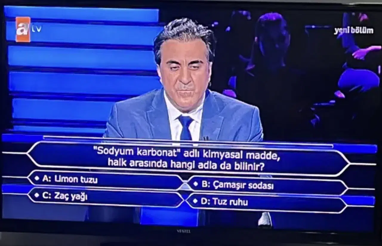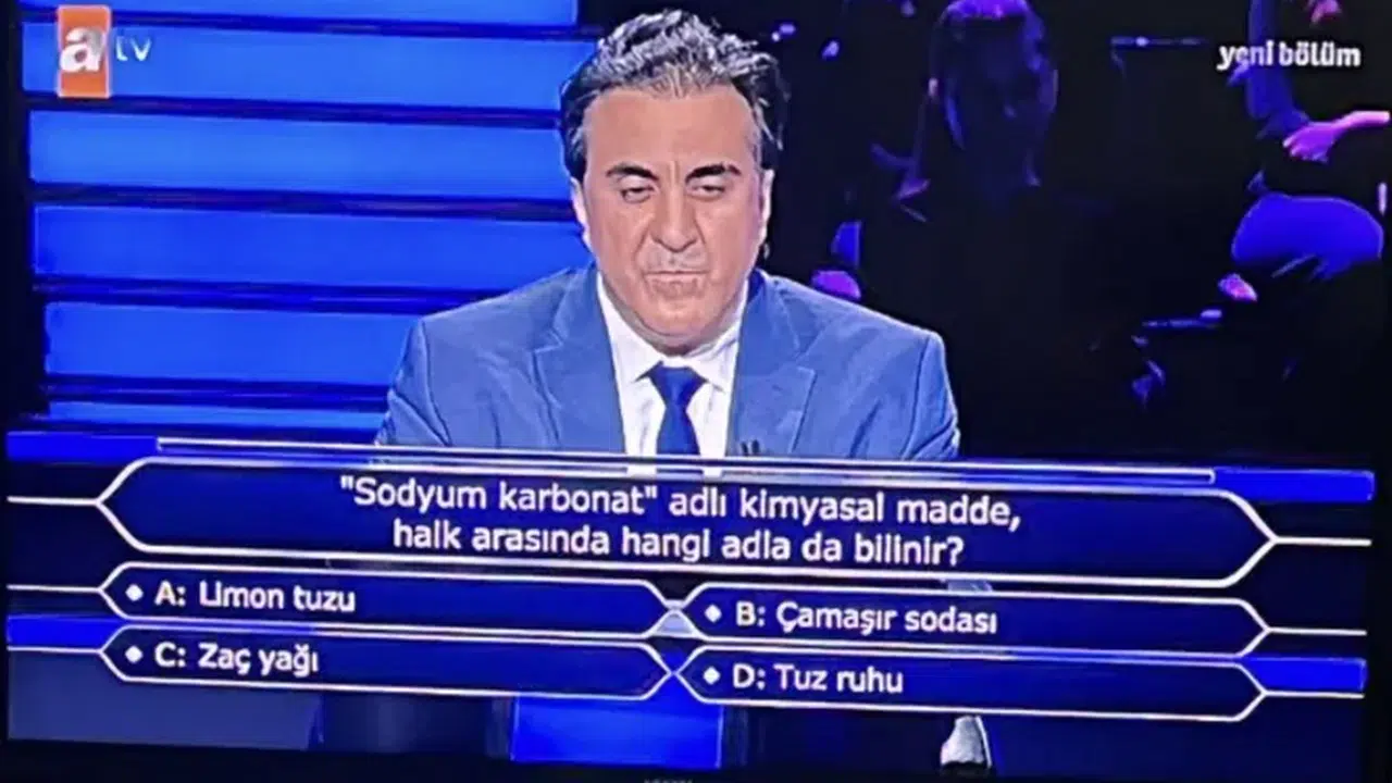 ATV’de Oktay Kaynarca’nın sunumuyla ekrana gelen Kim Milyoner Olmak İster’de kimya bilgisine dayalı bir soru dikkat çekti. “Sodyum karbonat” ile ilgili yöneltilen bu soru, hem yarışmacıyı hem de izleyicileri düşündürdü. Halk arasında farklı isimlerle bilinen maddelerle ilgili olması nedeniyle soru, sosyal medyada ve arama motorlarında yoğun ilgi gördü.