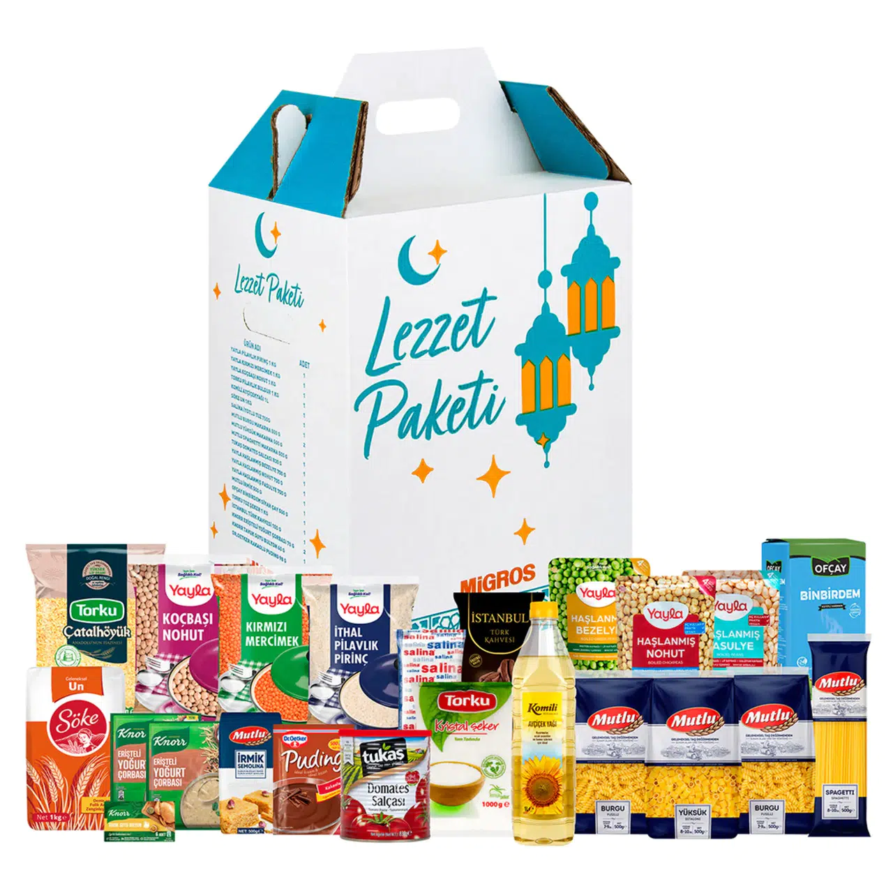 Migros Ramazan Lezzet Paketi, Ramazan ayı boyunca en sık tüketilen temel gıda ürünleriyle birlikte bakliyat, makarna, yağ ve içecek grubunu kapsayan zengin bir içerik sunuyor. 2026 yılı için açıklanan Migros Ramazan kolisi içeriği şu ürünlerden oluşuyor: