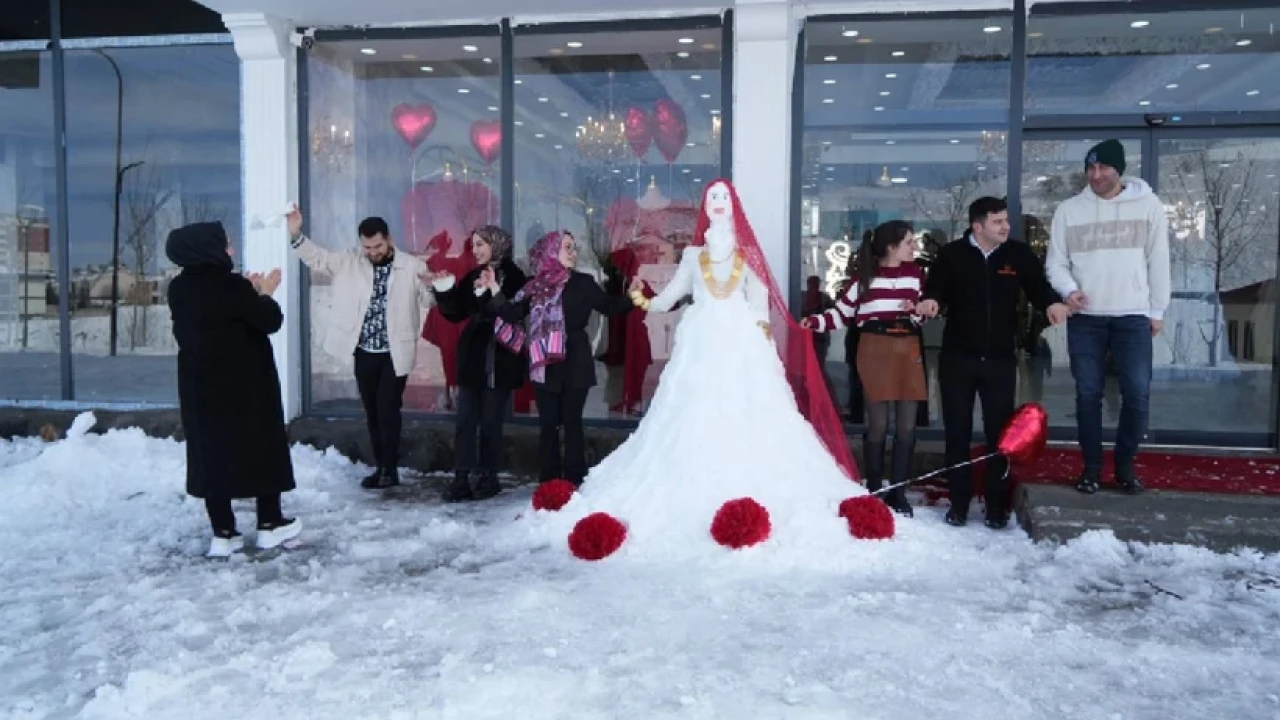 Muş'ta yoğun kar yağışının ardından, halk karla büyük bir yaratıcılıkla kardan bir gelin heykeli yaptı. Bu etkileyici figür, milyonlarca lira değerindeki altın takılarla süslendi ve ortaya eşsiz bir görüntü çıktı. Görenler, bu görsel şöleni hayranlıkla izlerken, şaşkınlıklarını gizleyemediler.