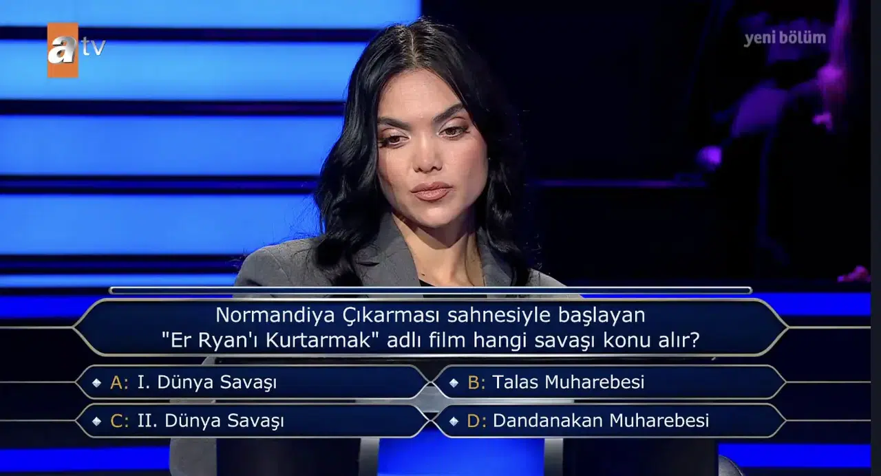 ATV ekranlarında yayınlanan Kim Milyoner Olmak İster yarışmasında yöneltilen sinema ve tarih temalı soru dikkat çekti. Dünyaca ünlü savaş filmi Er Ryan’ı Kurtarmak’ın hangi savaşı konu aldığı sorulurken, birçok kişi filmin gerçek olaylardan esinlenip esinlenmediğini de araştırmaya başladı. İşte yarışmada sorulan sorunun doğru cevabı ve Er Ryan’ı Kurtarmak filmine dair merak edilen detaylar…