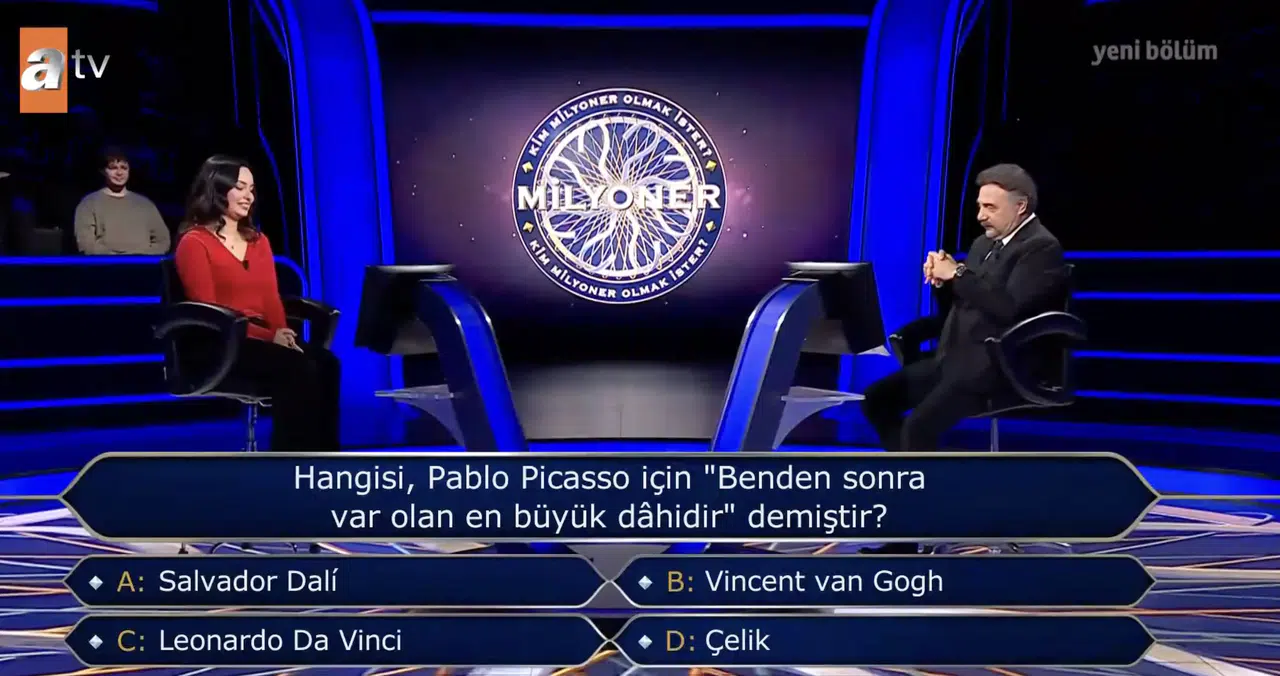 ATV ekranlarında Oktay Kaynarca’nın sunumuyla yayınlanan Kim Milyoner Olmak İster’de sorulan Pablo Picasso sorusu geceye damga vurdu. Picasso’nun “Benden sonra var olan en büyük dahi” sözleriyle işaret ettiği isim yarışmacıyı düşündürürken, ekran başındaki izleyiciler de cevabı araştırmaya başladı. Sanat ve tarih bilgisini ölçen bu soru sosyal medyada da büyük merak uyandırdı.