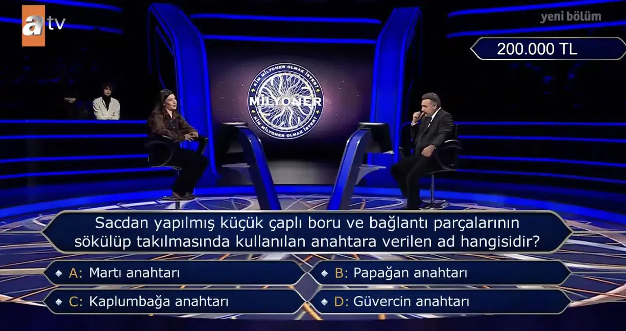 ATV ekranlarının ilgiyle izlenen yarışması Kim Milyoner Olmak İster, bu kez teknik bilgi gerektiren bir soruyla gündeme geldi. Özellikle el aletlerine aşina olan izleyicilerin dikkatini çeken soru, kısa sürede sosyal medyada yayılmaya başladı. Sacdan yapılmış küçük çaplı boruların sökülüp takılmasında kullanılan anahtarın adı, yarışmanın en çok konuşulan sorularından biri haline geldi.