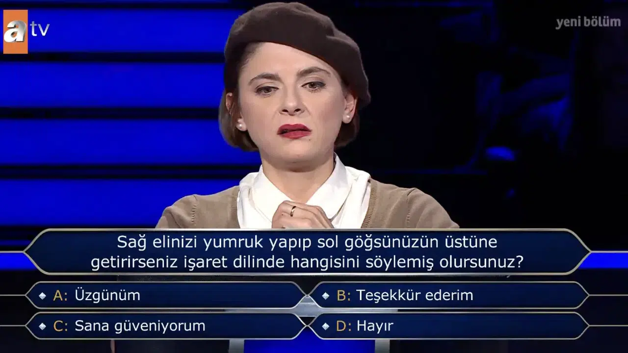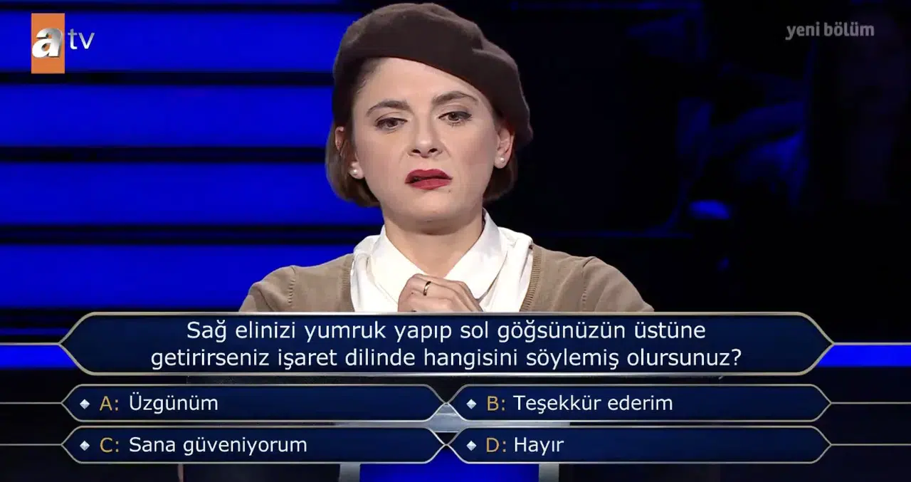 Bilgi yarışmalarında sorulan işaret dili soruları, hem dikkat hem de farkındalık gerektiren başlıklar arasında yer alıyor. Günlük hayatta basit görünen hareketlerin aslında belirli anlamlar taşıması, bu tür soruları daha da ilgi çekici hale getiriyor. “Sağ elinizi yumruk yapıp sol göğsünüzün üstüne getirirseniz ne anlama gelir?” sorusu da son dönemde en çok araştırılan konular arasında yer aldı.