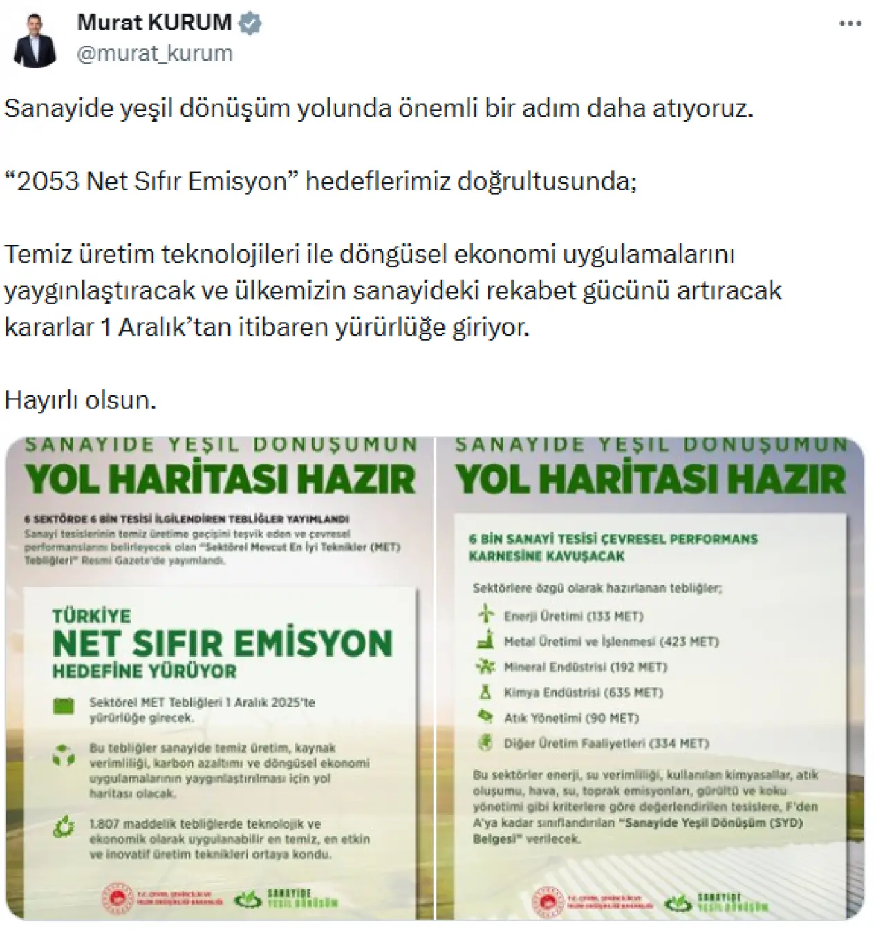 Bakan Murat Kurum, sosyal medya hesabından yaptığı açıklamada, “Sanayide yeşil dönüşüm yolunda önemli bir adım daha atıyoruz. Temiz üretim teknolojileri ve döngüsel ekonomi uygulamalarını yaygınlaştıracak kararlar 1 Aralık’tan itibaren yürürlüğe giriyor. Ülkemizin sanayideki rekabet gücünü artıracak” dedi.