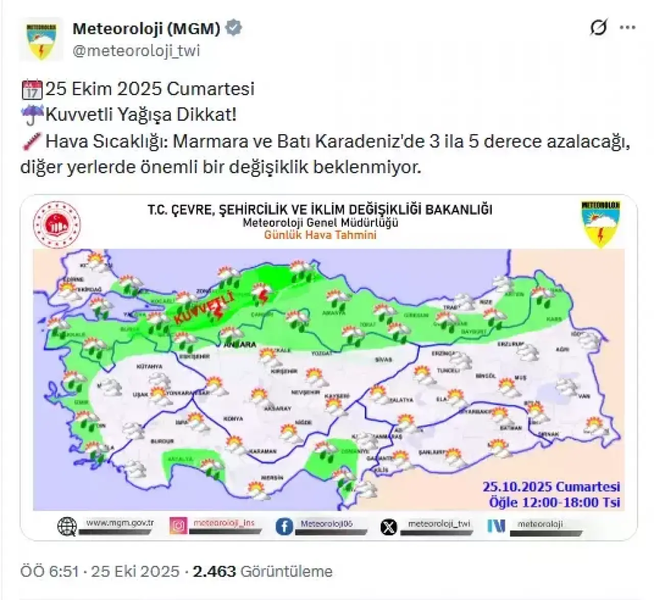 Meteoroloji Genel Müdürlüğü, hafta sonu boyunca yurt genelinde etkili olacak yağışlarla ilgili uyarılarda bulundu. Marmara ve Karadeniz’de kuvvetli sağanak, Doğu Anadolu’nun yüksek kesimlerinde ise karla karışık yağmur bekleniyor. Hava sıcaklıklarının bazı bölgelerde 3 ila 5 derece azalacağı öngörülürken, 12 il için sarı kodlu uyarı yayımlandı.