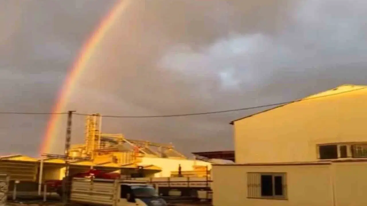 Şanlıurfa’nın Siverek ilçesinde etkili olan sağanak yağışın yerini güneşli havaya bırakmasıyla birlikte gökyüzünde oluşan renk cümbüşü, görenleri kendine hayran bıraktı.