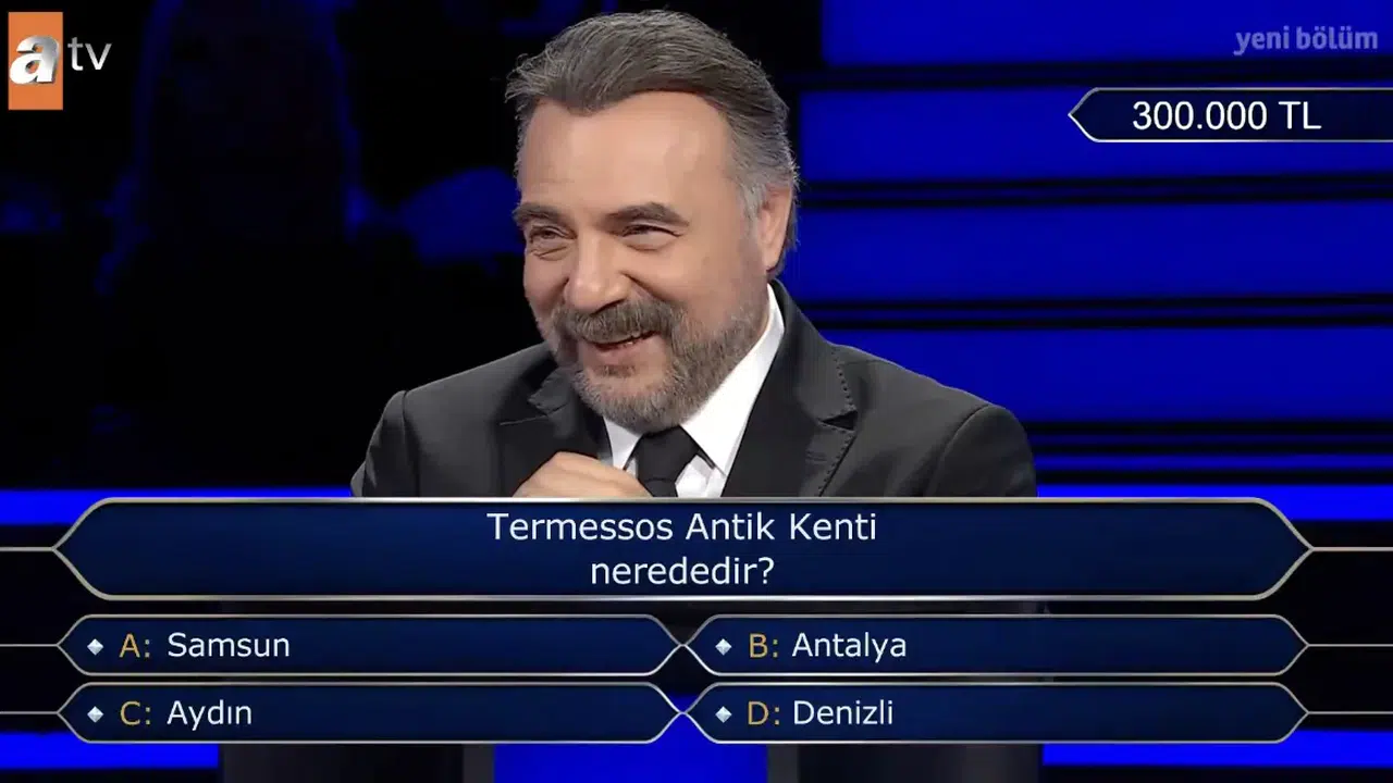 ATV ekranlarının sevilen yarışması Kim Milyoner Olmak İster, bu kez tarih ve coğrafya bilgisini ölçen dikkat çekici bir soruyla izleyicilerin karşısına çıktı. Termessos Antik Kenti’nin hangi ilde bulunduğuna dair yöneltilen soru, kısa sürede en çok aranan konular arasına girdi. Özellikle seçenekler arasında yer alan şehirler, izleyiciler arasında kafa karışıklığına neden oldu.