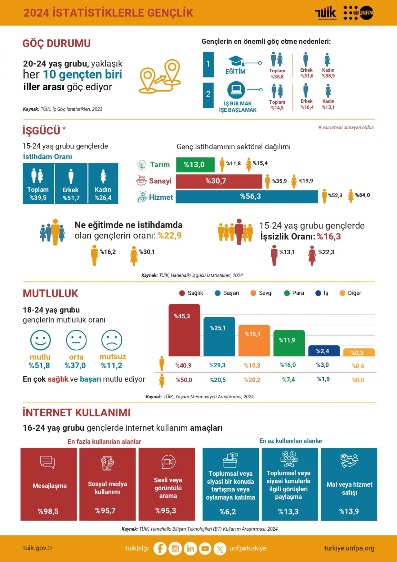 TÜİK'in yaşam memnuniyeti araştırması sonuçları, ev genci olgusunun psikolojik boyutuna ışık tutuyor. 18-24 yaş grubu gençlerin mutluluk kaynakları arasında "iş" faktörü sadece %2,4 ile en sonda yer alıyor. Gençleri en çok mutlu eden faktörler sırasıyla sağlık (%45,3), başarı (%25,1) ve sevgi (%15,1) olarak belirlenmiş durumda.