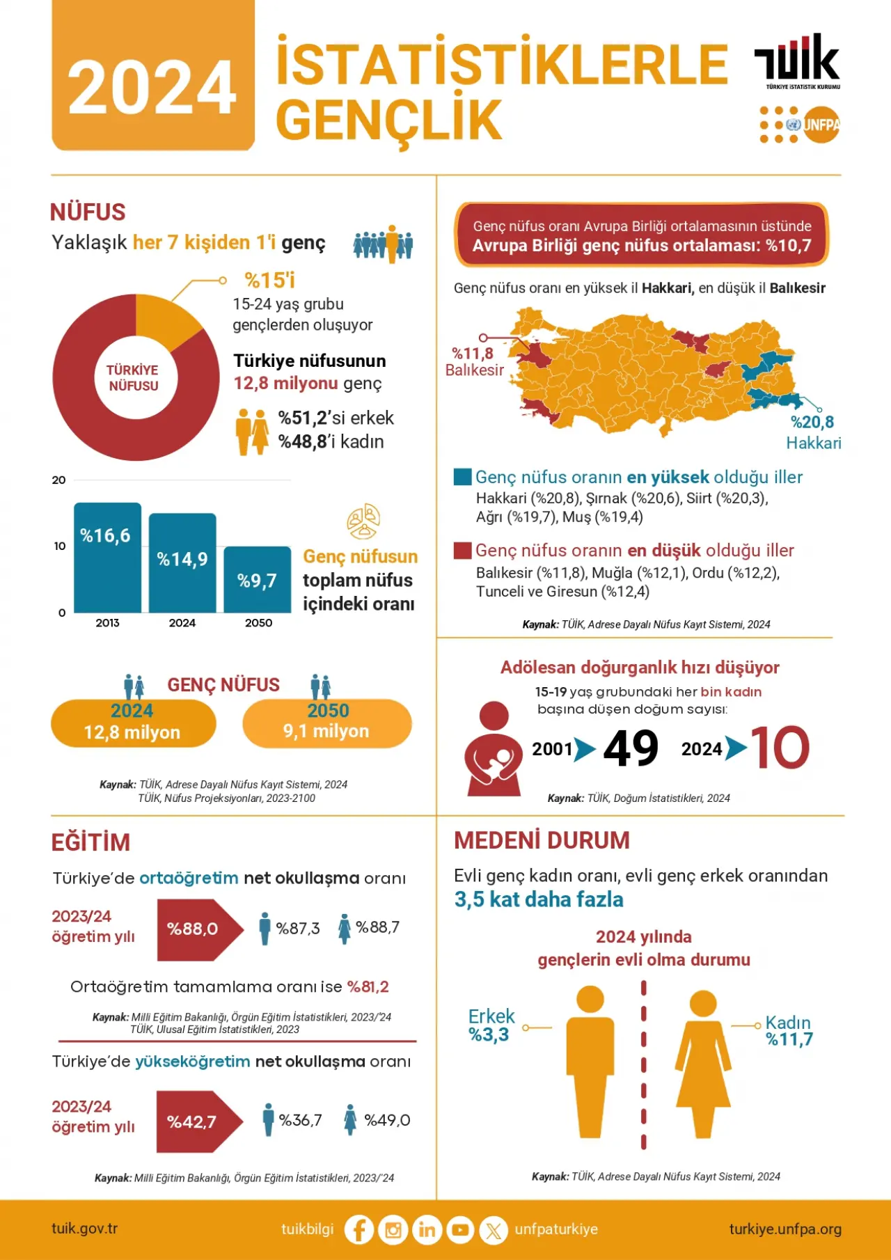 TÜİK raporunun ortaya koyduğu bir başka önemli veri, Türkiye'nin genç nüfus oranının Avrupa Birliği ortalamasının üzerinde olması. Türkiye nüfusunun %15'i (12,8 milyon kişi) 15-24 yaş aralığındaki gençlerden oluşurken, AB'de bu oran %10,7 seviyesinde bulunuyor. Ancak projeksiyonlar, 2050 yılında Türkiye'deki genç nüfusun 9,1 milyona düşeceğini gösteriyor.