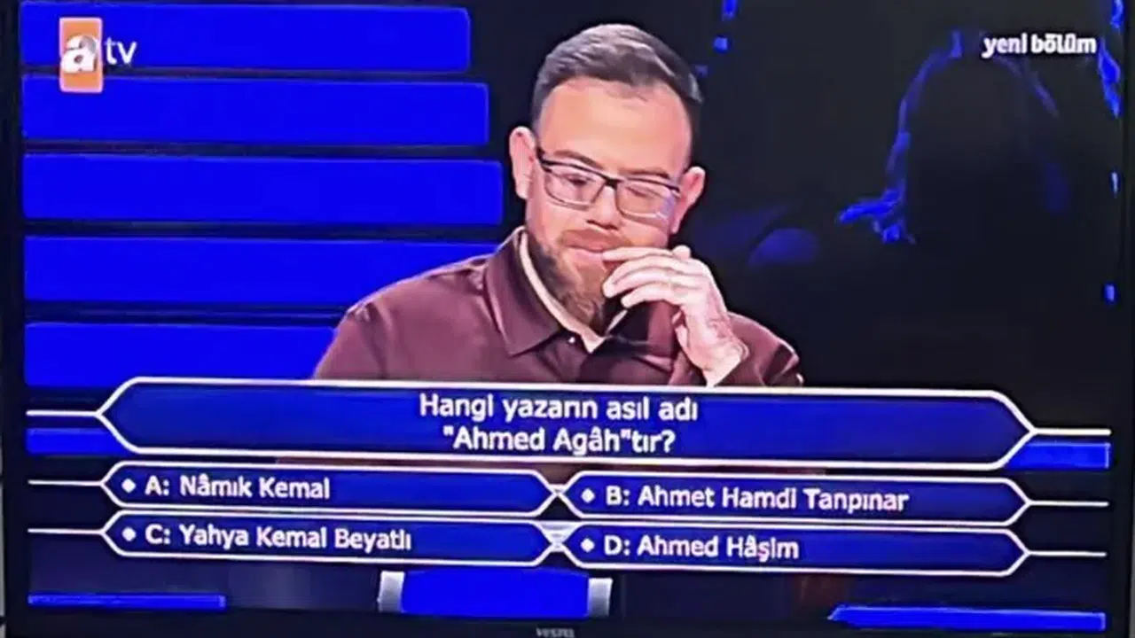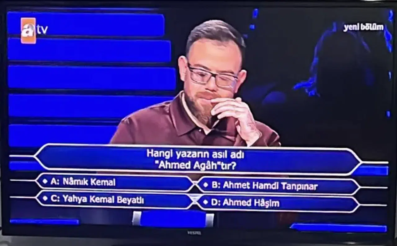 Türk edebiyatının önemli isimlerinden birinin gerçek adıyla ilgili olan soru; Namık Kemal, Ahmet Hamdi Tanpınar, Yahya Kemal Beyatlı ve Ahmed Hâşim seçenekleriyle hem yarışmacının bilgisini hem de izleyicilerin edebiyat hafızasını sınadı.
