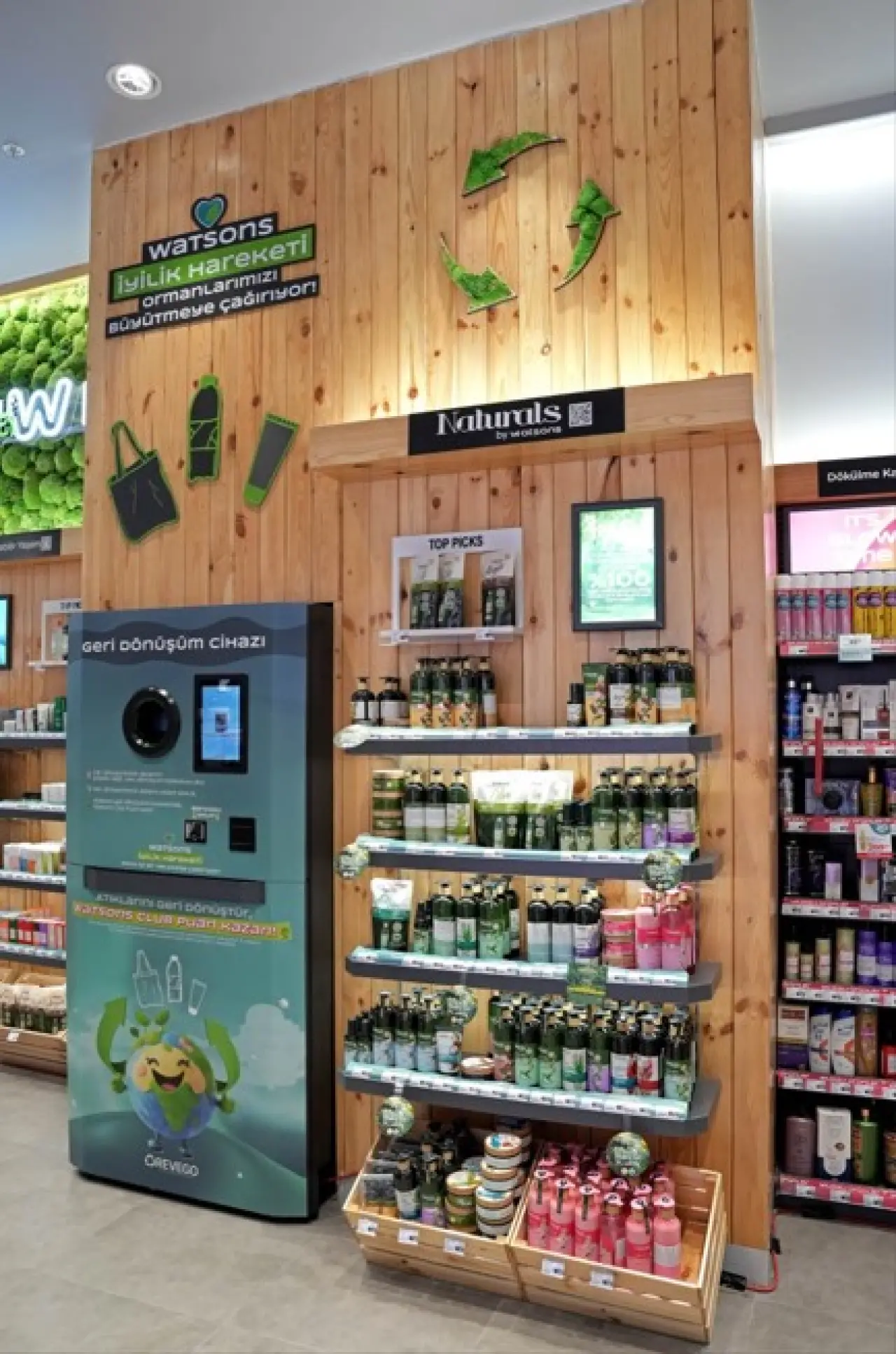 Mağazada öne çıkan “Sürdürülebilir Yaşam Alanı”, doğa dostu içeriklere sahip ürünler ve geri dönüştürülebilir ambalajları bir araya getirerek bilinçli tüketimi destekliyor. Aynı zamanda Türkiye’de ilk kez bu mağazada kurulan Watsons Geri Dönüşüm Cihazı; plastik, cam, kâğıt ve alüminyum ambalajları toplayarak #WatsonsİyilikHareketi projesine katkı sağlıyor. Cihazın yanında konumlandırılan özel kutular ise barkodsuz ambalajların ayrıştırılmasını kolaylaştırıyor.