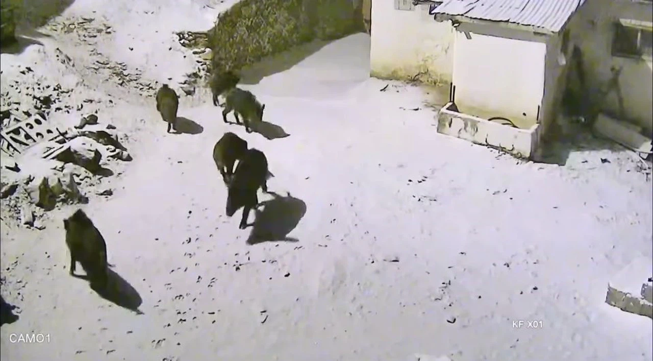 Elazığ’da kar yağışı sonrası doğada yiyecek bulmakta güçlük çeken domuzlar, Baskil ilçesi Hacıhüseyinler köyüne indi. Köyün içerisinde bulunan güvenlik kamerasına yansıyan domuz sürüsü bir süre sonra gözden kayboldu. O anlar güvenlik kamerası tarafından saniye saniye kaydedildi.