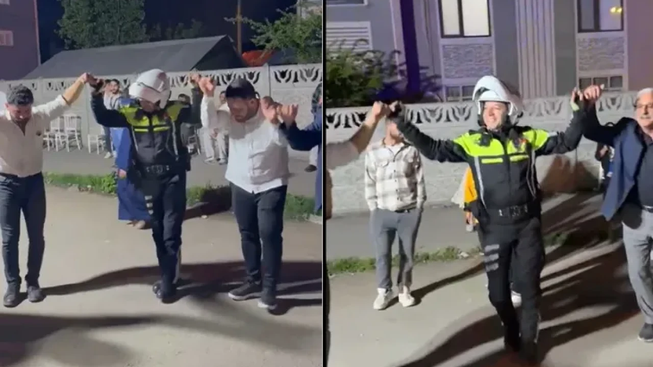 Görevini tamamladıktan sonra düğün sahiplerinin yoğun ısrarıyla halaya davet edilen trafik polisi, başındaki kaskla birlikte müziğe eşlik ederek renkli anlara imza attı.