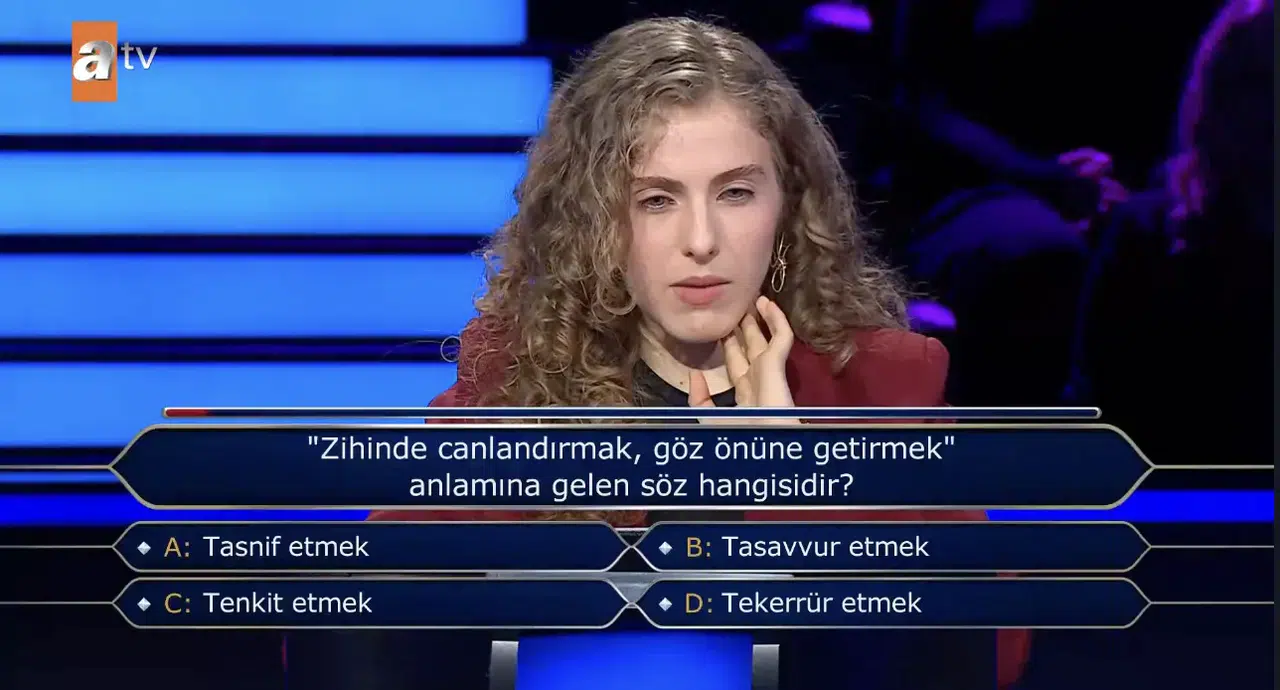 Dil bilgisi ve kelime anlamı soruları, bilgi yarışmalarında en çok dikkat çeken başlıklar arasında yer alıyor. Özellikle günlük hayatta sık kullanılan ancak anlamı karıştırılan kelimeler, yarışmacıları zorlayabiliyor. “Zihinde canlandırmak, göz önüne getirmek” ifadesine karşılık gelen doğru söz de bu kapsamda merak edilen sorular arasında bulunuyor.