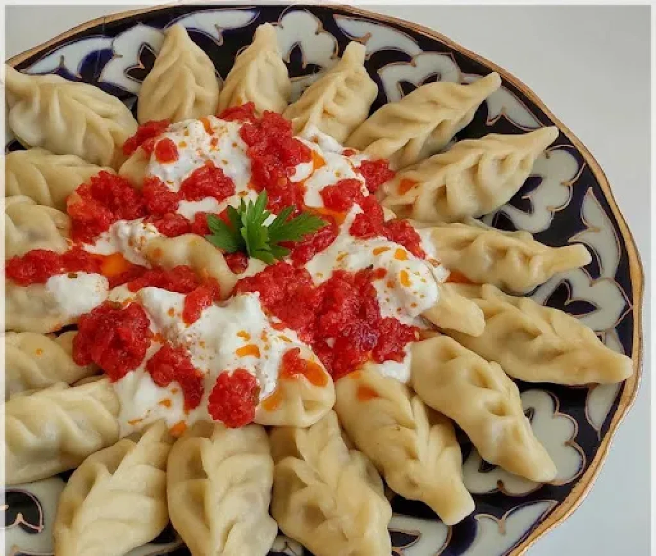 Servis öncesi üzerine sarımsaklı yoğurt ve tereyağında kızdırılmış biberli sos dökerek sunum yapın.