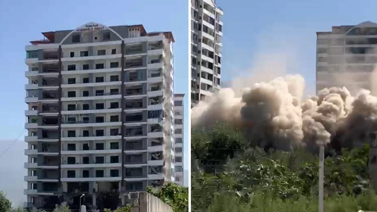 Bu sabah yasal işlemleri tamamlanan bina için yıkım çalışması başlatıldı. 14 katlı bina kontrollü şekilde yıkılırken, o anlar cep telefonu kamerasına yansıdı.