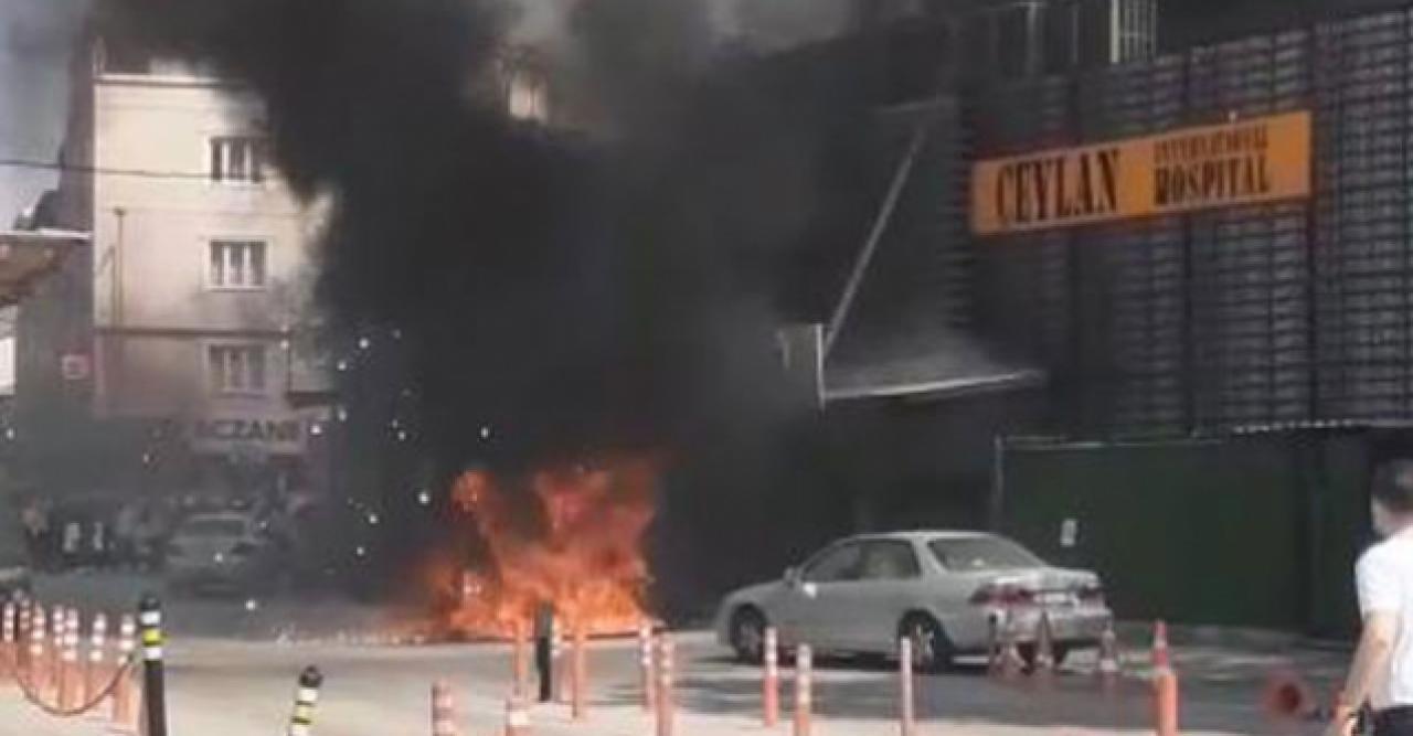Otomobilin alev alma anı, çevredeki bir iş yerinin güvenlik kamerasınca kaydedildi.