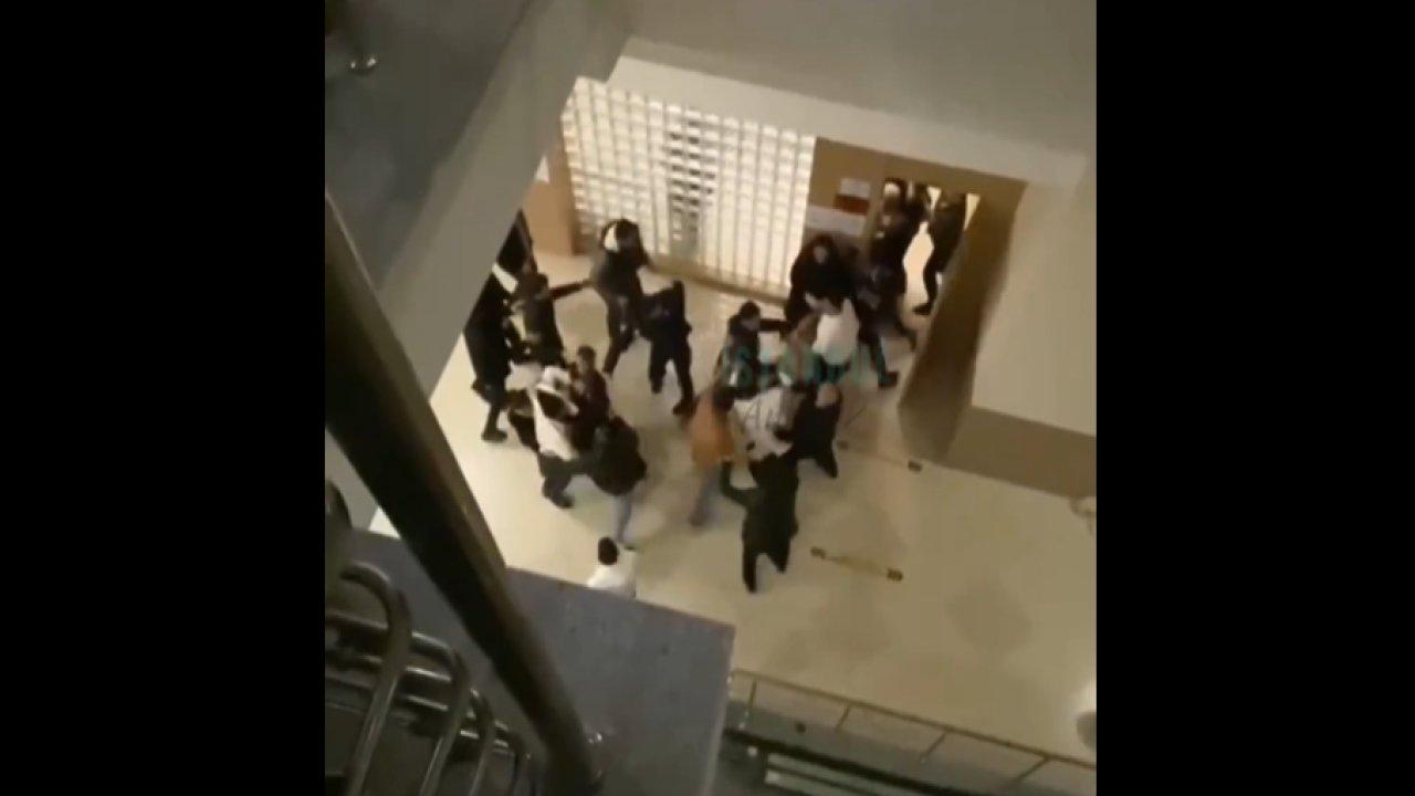 Birbirinlerine tekme ve yumruklarla saldıran iki grubu ayırmak için polisler olay yerine geldi. Yere düşen bir kişinin tekmelere maruz kaldığı kavgada polisler kavga edenleri ayırmak için büyük çaba sarf etti.
