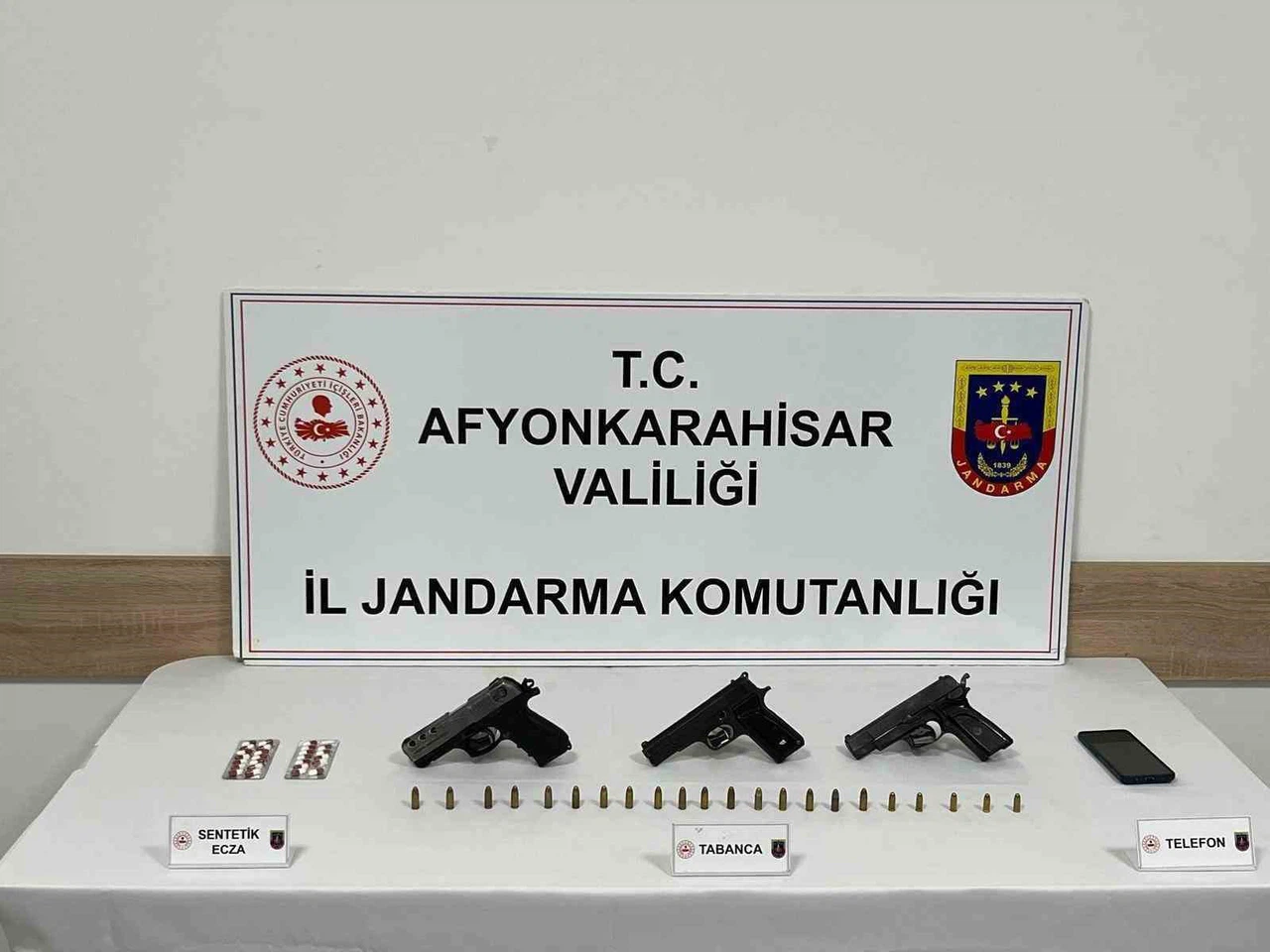 Afyonkarahisar’da jandarma ekiplerinin düzenlediği operasyonda uyuşturucu hap ve ruhsatsız tabancalar ele geçirilirken, gözaltına alınan şüpheli tutuklandı.